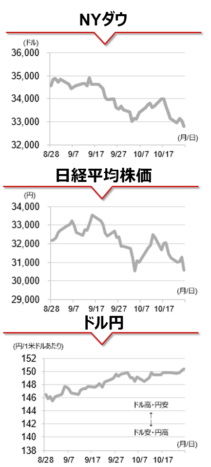 (注)データは日本時間2023年10月27日午前7時半頃、QUICKより取得。ただしドル円相場の前日の数値は日銀公表値で、東京市場、取引時間ベース。CME日経平均先物は、直近限月。チャートは日次終値ベースですが、直近値は終値ではない場合があります。