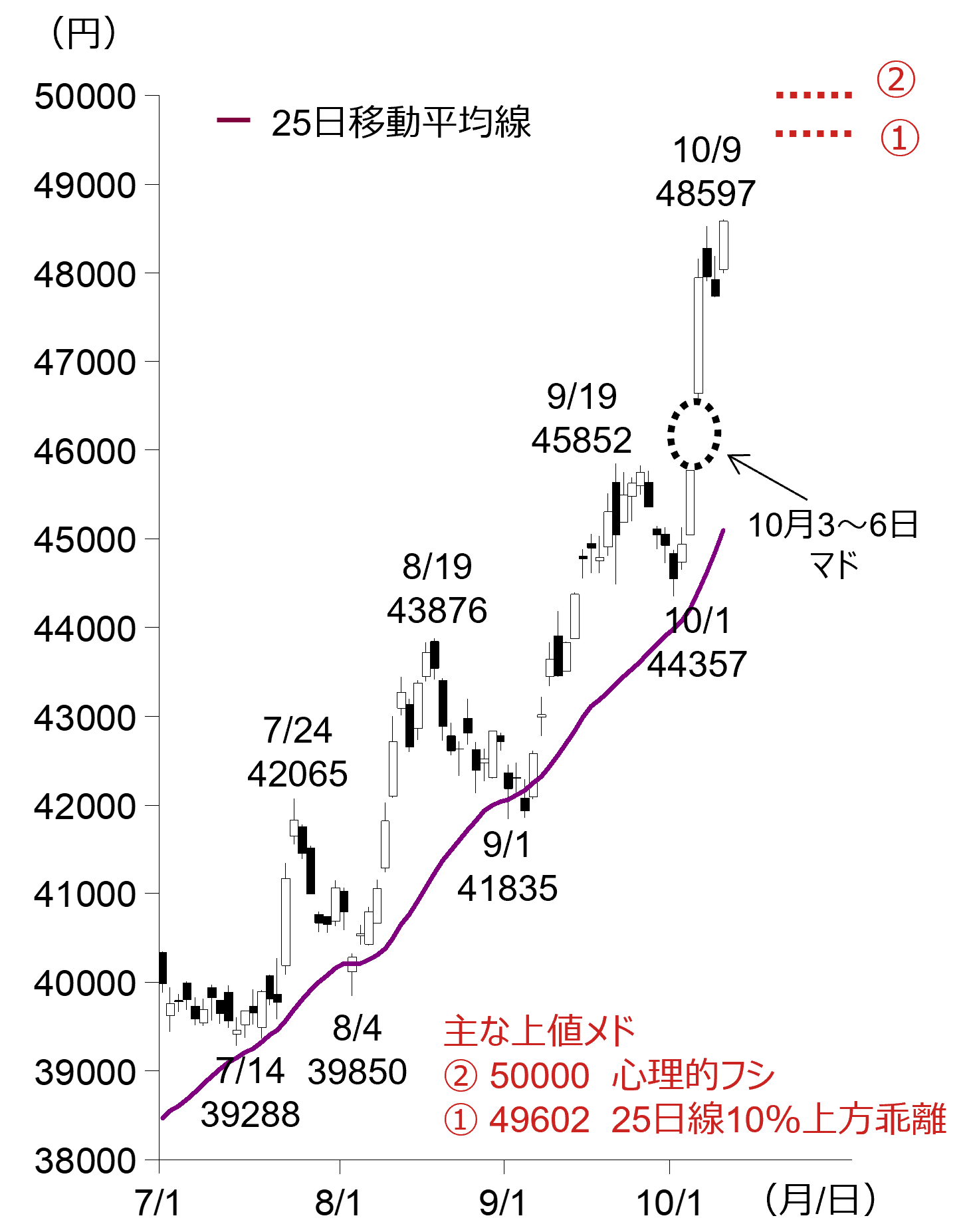 この先、信用取引の売り方の買戻しが進む等してさらなる上昇となった場合、上値メドとして25日移動平均線からの10%上方乖離水準(10月9日:49,602円)や、心理的フシである5万円の水準が挙げられます。