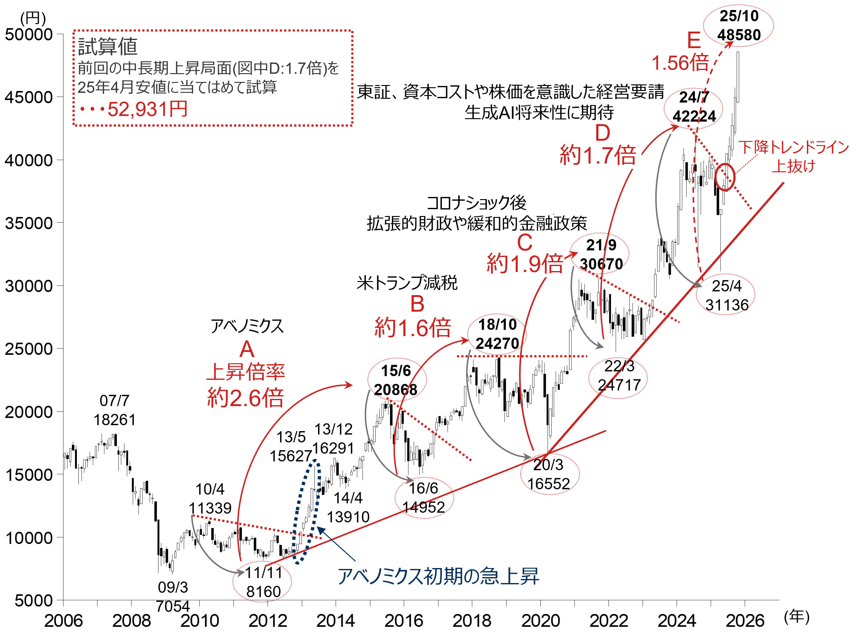 日経平均は、2025年4月の安値形成後に中長期の上昇局面に入ったと考えられます。前回の中長期上昇局面(2022年3月~24年7月)は、上昇倍率が約1.7倍、期間は約2年でした。これを2025年4月の安値に当てはめて試算すると、2027年には約5万3千円に達する計算となり、先行きの上昇余地は大きいと見られます。