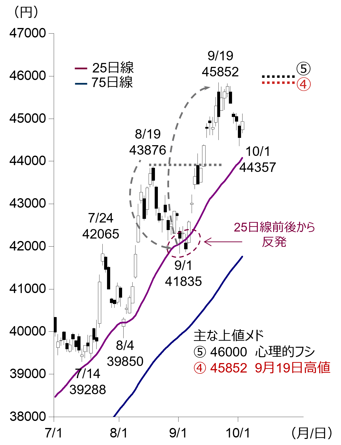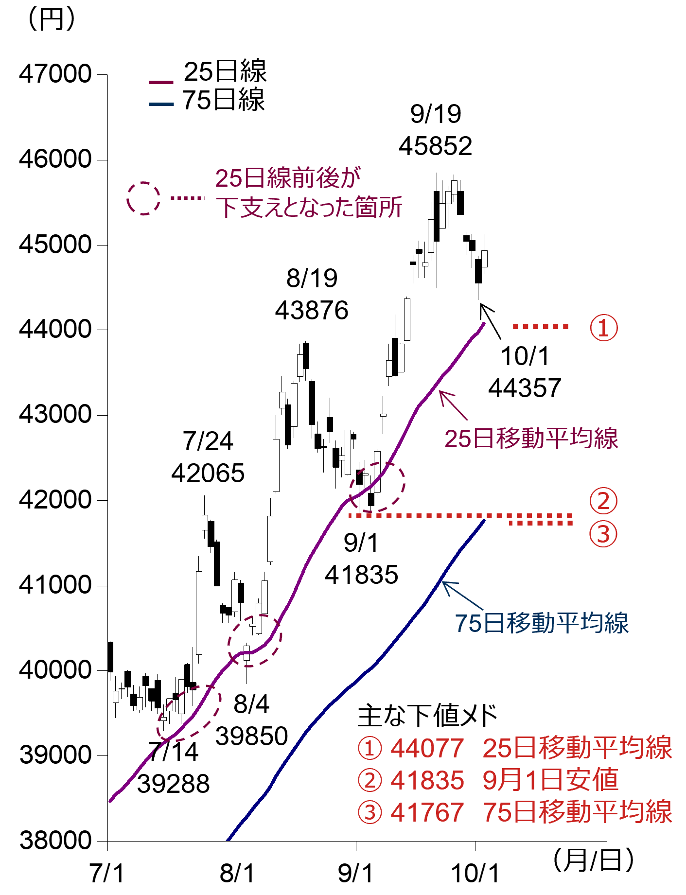 この先、今年6月以降何度も下支えとなっている上向きの25日移動平均線(図1-①:10月2日時点44,077円)前後で下げ止まるかが注目されます。ただし、今年4月の安値から9月高値まで約半年で約1万5千円(取引時間中ベース)の急上昇となっているため、先行きはこの25日線を割り込む調整が起こる可能性にも注意が必要です。その場合のさらなる下値メドとして、9月1日安値(図1-②:41,835円)や75日線(図1-③:同41,767円)の水準が挙げられます。