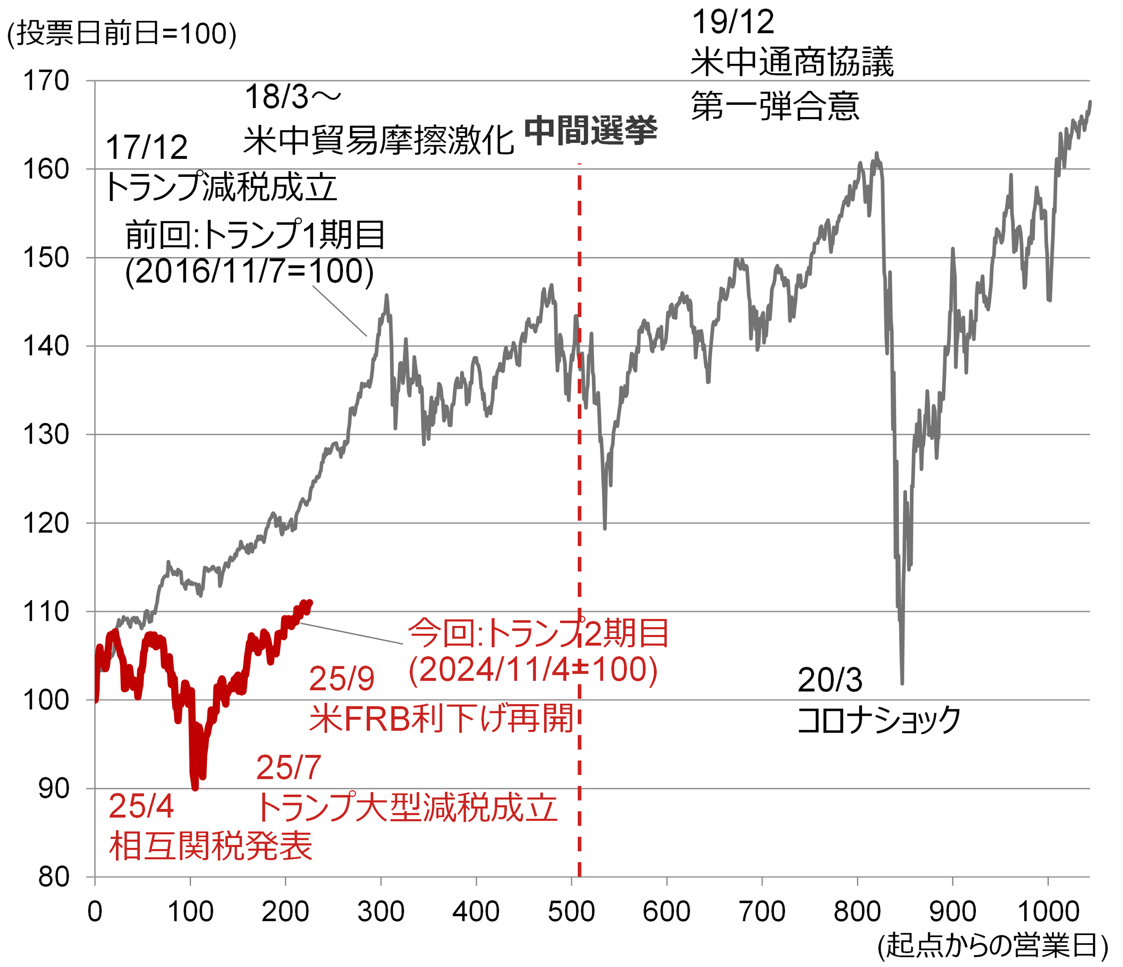 (注)灰色グラフの表示期間はトランプ1.0の投票日前日2016/11/7~2020年末。赤色グラフはトランプ2.0の投票日前日2024/11/4~2025/9/30(直近値)。