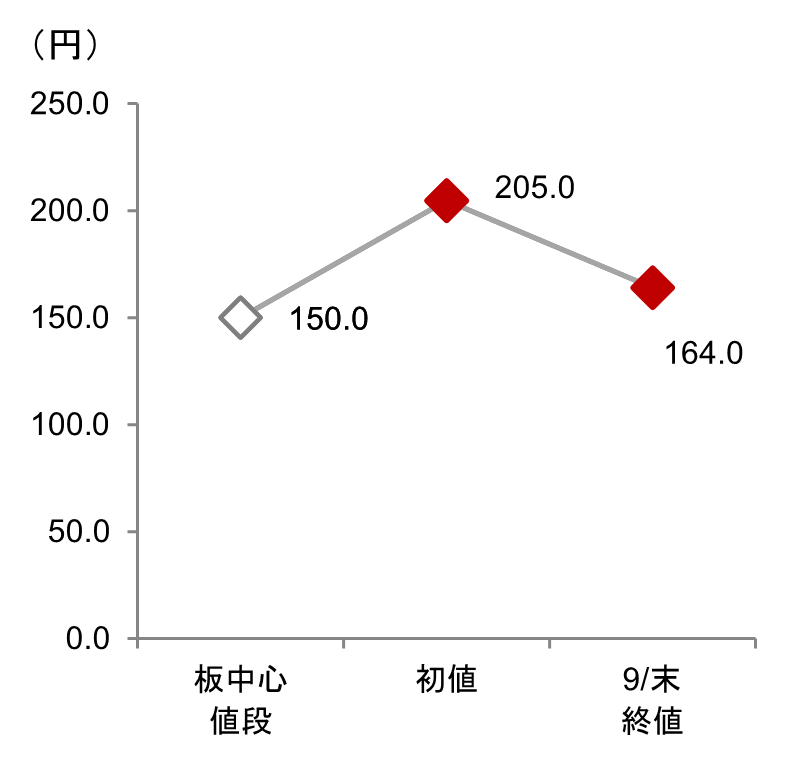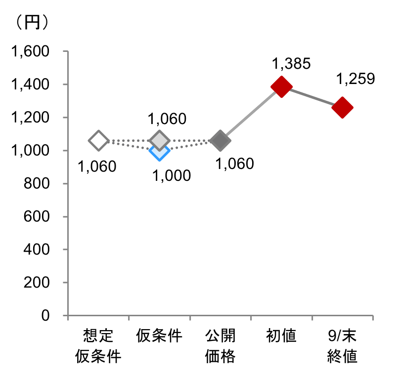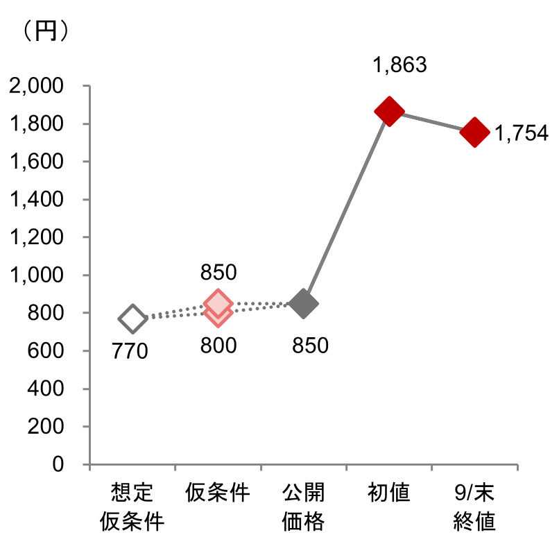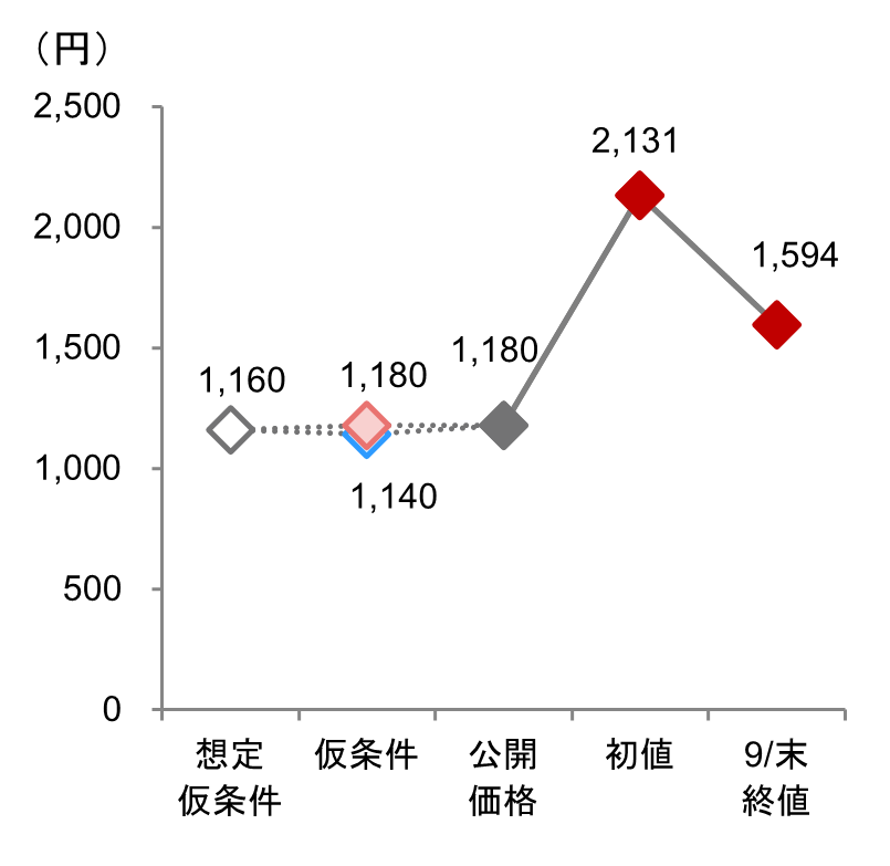 (注1)初値及び直近月末終値が公開価格に対して上回っているものは赤、下回っているものは青で表示。