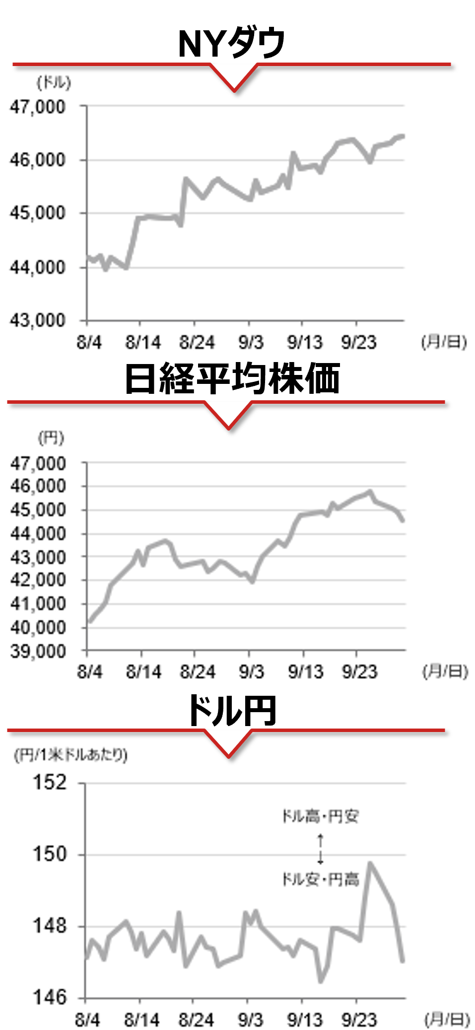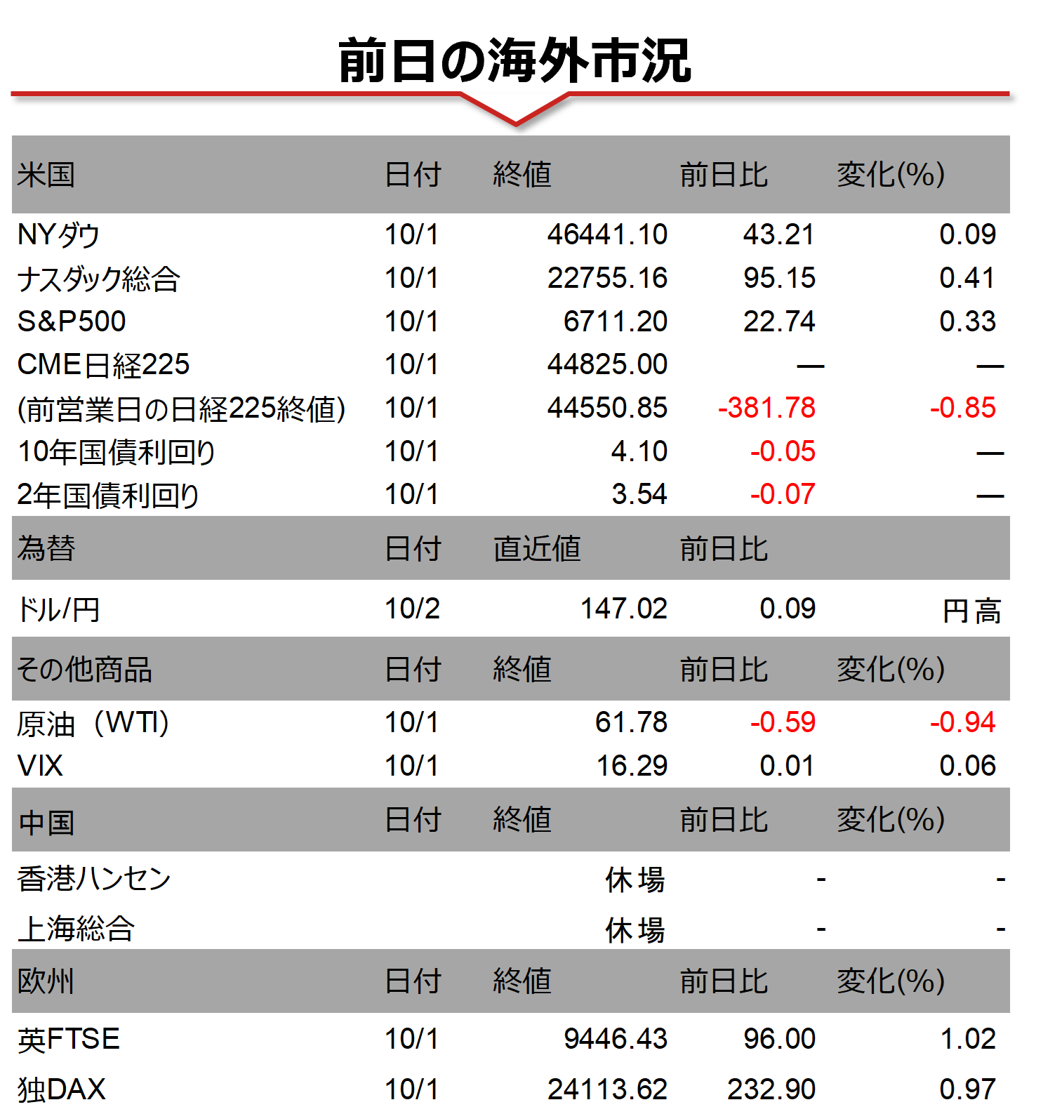 注)データは日本時間2025年10月2日午前7時半頃、QUICKより取得。ただしドル円相場の前日の数値は日銀公表値で、東京市場、取引時間ベース。CME日経平均先物は、中心限月。チャートは日次終値ベースですが、直近値は終値ではない場合があります。
