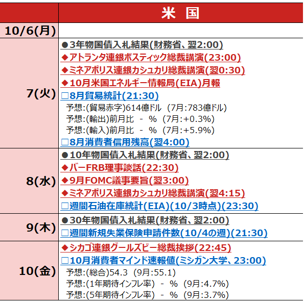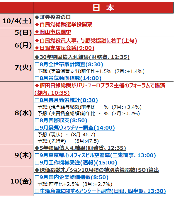 日本に関しては、政治面では自民党総裁選後の与野党協議の行方が注目されます。金融政策面での注目点としては、6日(月)の日銀支店長会議が挙げられます。10月の金融政策決定会合はライブ(政策変更もあり得る)だとの見方が高まっているうえ、直近の日銀短観(9月調査)は大企業製造業の景況感が2四半期連続で改善する結果になりました。地方の景気動向を踏まえた上で、植田総裁の発言が注目されます。経済指標では8日(水)の8月毎月勤労統計、9月景気ウォッチャー調査と今後の景気動向を見極める上で注目度の高い指標が発表されます。