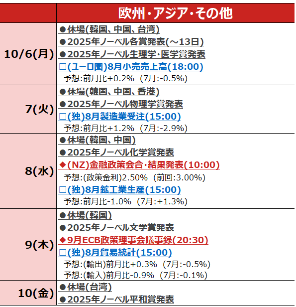 (注1)イベントは全てを網羅しているわけではない。◆は政治・政策関連、□は経済指標、●はその他イベント(カッコ内は日本時間)。休場・短縮取引は主要な取引所のみ掲載。各種イベントおよび経済指標の市場予想(ブルームバーグ集計に基づく中央値)は2025年10月3日時点の情報に基づくものであり、今後変更される可能性もあるためご留意ください。