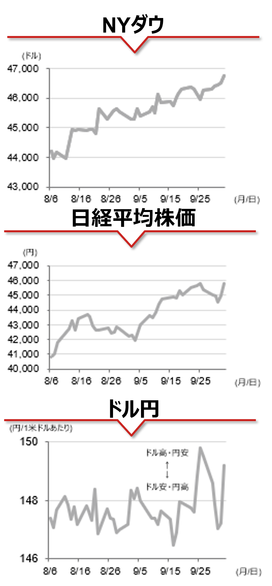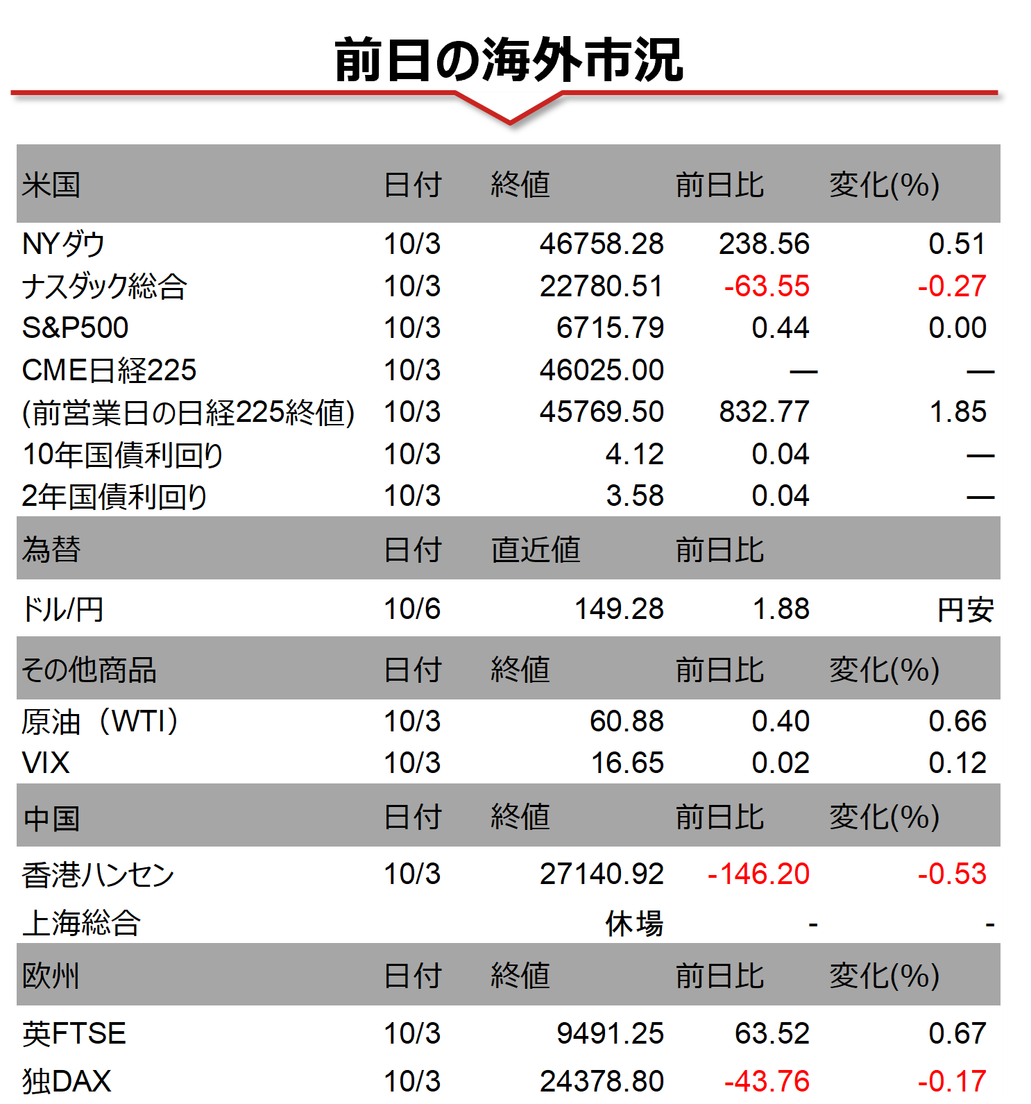 注)データは日本時間2025年10月6日午前7時半頃、QUICKより取得。ただしドル円相場の前日の数値は日銀公表値で、東京市場、取引時間ベース。CME日経平均先物は、中心限月。チャートは日次終値ベースですが、直近値は終値ではない場合があります。