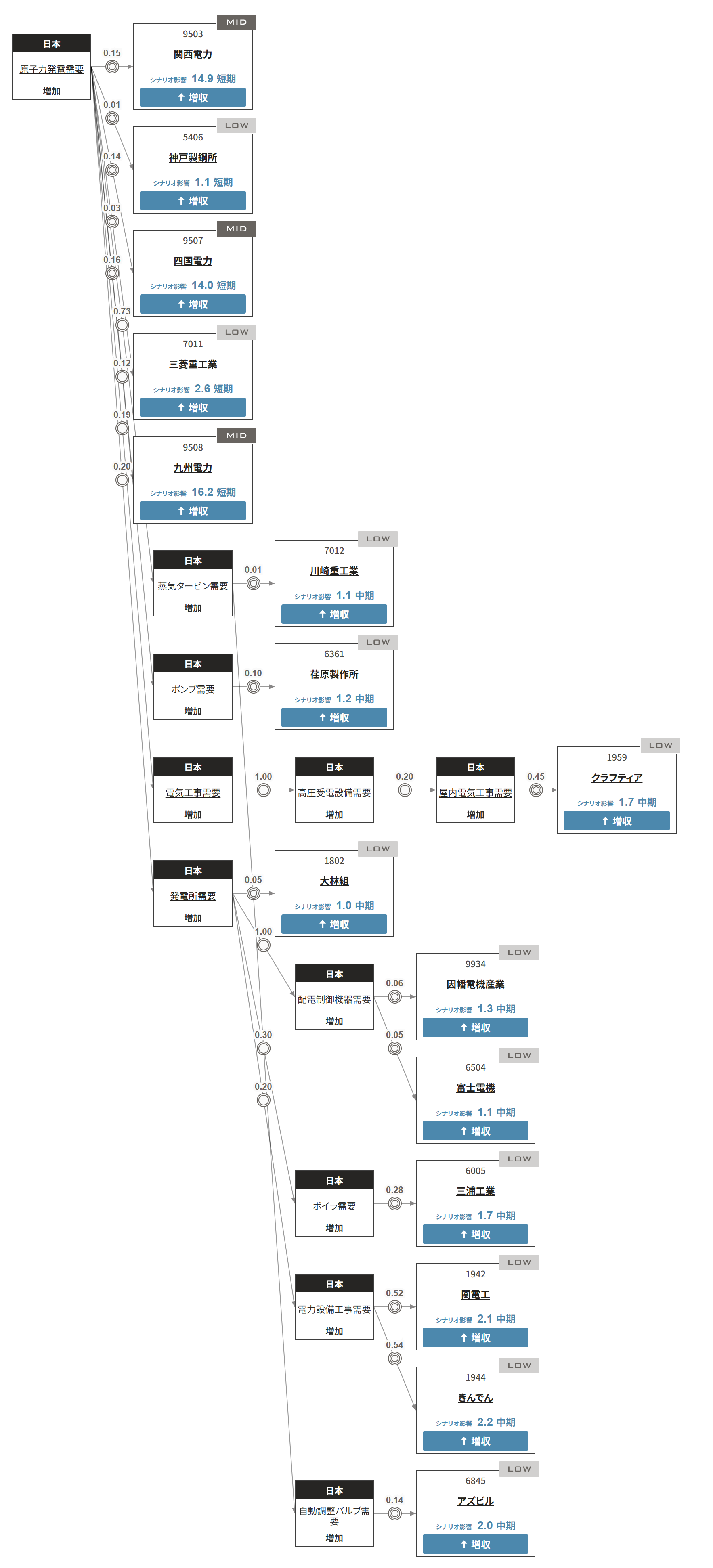 自民党の第29代総裁となった高市早苗氏は、かねてより原発推進の立場を示し、「次世代革新炉」や「核融合炉」の早期実装、原発再稼働の重要性を主張してきました。今後、原子力規制委員会の審査の迅速化や、定期検査の間隔延長など、原発の新設・再稼働を後押しする議論が進む可能性があります。AI「xenoBrain」は、「原子力発電需要増加」が他のシナリオにも波及する可能性を考慮し、影響が及ぶ可能性のある15銘柄を選出しました。