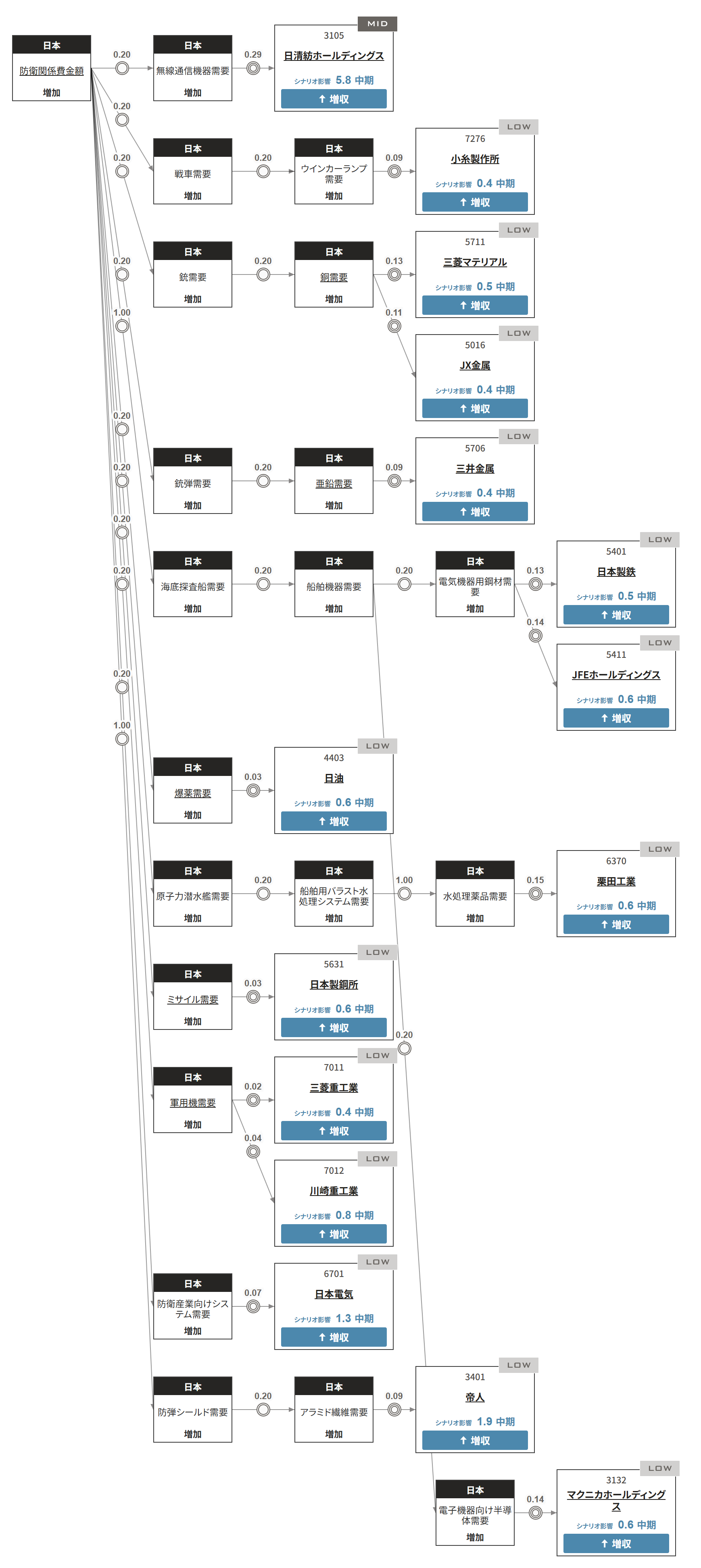 自民党の第29代総裁となった高市早苗氏は、防衛費の増額に前向きな姿勢を示しています。同氏は、2027年度に防衛費をGDP(国内総生産)比で2%まで引き上げると定めた安保関連3文書について、米シンクタンクへの10月1日付の寄稿で、「必要な戦略と防衛装備の在り方について、不断に検討を重ねていくことが重要」との考えを表明しました。こうした方針を受けて、防衛関連株への関心が金融市場で高まる可能性があります。AI「xenoBrain」は、「防衛関係費金額増加」が他のシナリオにも波及する可能性を考慮し、影響が及ぶ可能性のある15銘柄を選出しました。