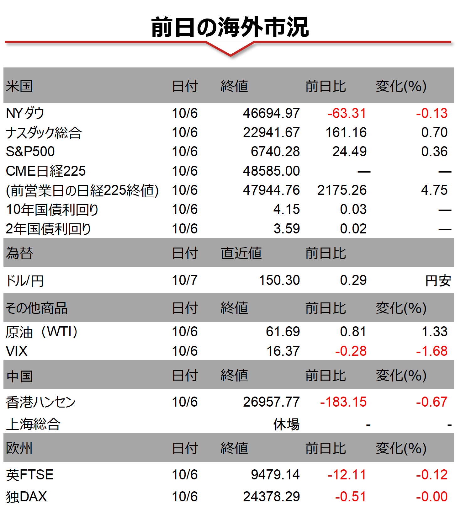 6日の米国株式市場では、NYダウが7営業日ぶりに反落しました。前週末まで連日で最高値を更新していたことから高値警戒感が意識され、主力株の一角に利益確定の動きが出たことが重石となりました。一方、FRBが今月のFOMCで追加利下げを決定するとの観測は引き続き相場を支え、朝方はプラス圏で推移する場面もみられました。また、NYダウ構成銘柄ではないものの、オープンAIとの複数年契約が報じられた半導体のアドバンスト・マイクロ・デバイセズ(AMD)が急騰し、他のAI関連銘柄に買いが波及する場面もみられました。S&P500は4営業日連続で、ナスダック総合は2営業日ぶりに、史上最高値を更新しました。為替市場では、日銀に対する10月利上げ期待後退が円安圧力となり、ドル円は150円台を回復しています。