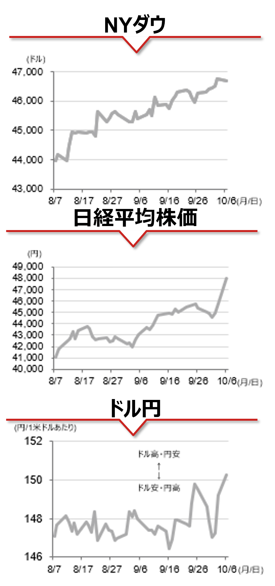 注)データは日本時間2025年10月7日午前7時半頃、QUICKより取得。ただしドル円相場の前日の数値は日銀公表値で、東京市場、取引時間ベース。CME日経平均先物は、中心限月。チャートは日次終値ベースですが、直近値は終値ではない場合があります。