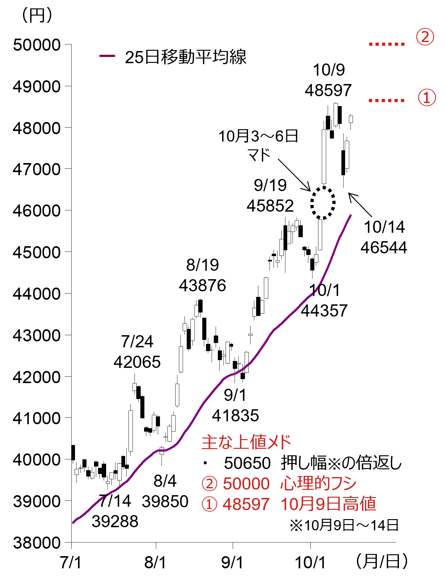 チャート分析の視点から振り返ってみましょう。日経平均は高市自民党新総裁誕生後初の取引日となった10月6日にマドを開けて急騰し、9日には48,500円台まで上昇しました。ただ、その後は国内政治不透明感や米中対立激化への懸念から一時的に大幅安となる等、高値圏で不安定な展開となっています。