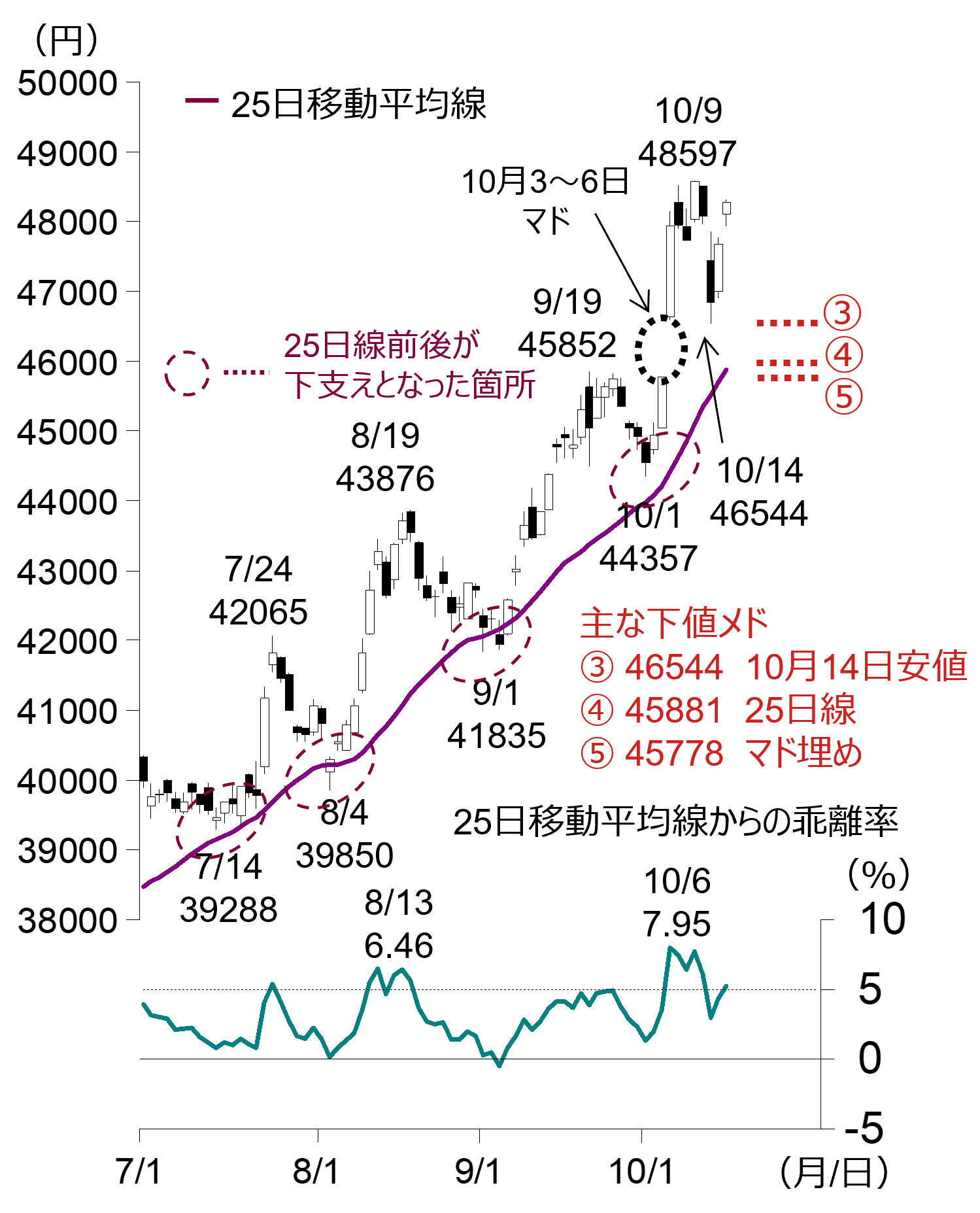 一方で、10月9日高値前後で上昇の勢いが衰え、調整に入った場合は、10月14日安値(図2-③46,544円)やこれまで何度も下支えとなっている上向きの25日移動平均線(図2-④:10月16日時点45,881円)前後、10月3~6日のマド埋め水準(図2-⑤:45,778円)で下げ止まるかが注目されます。