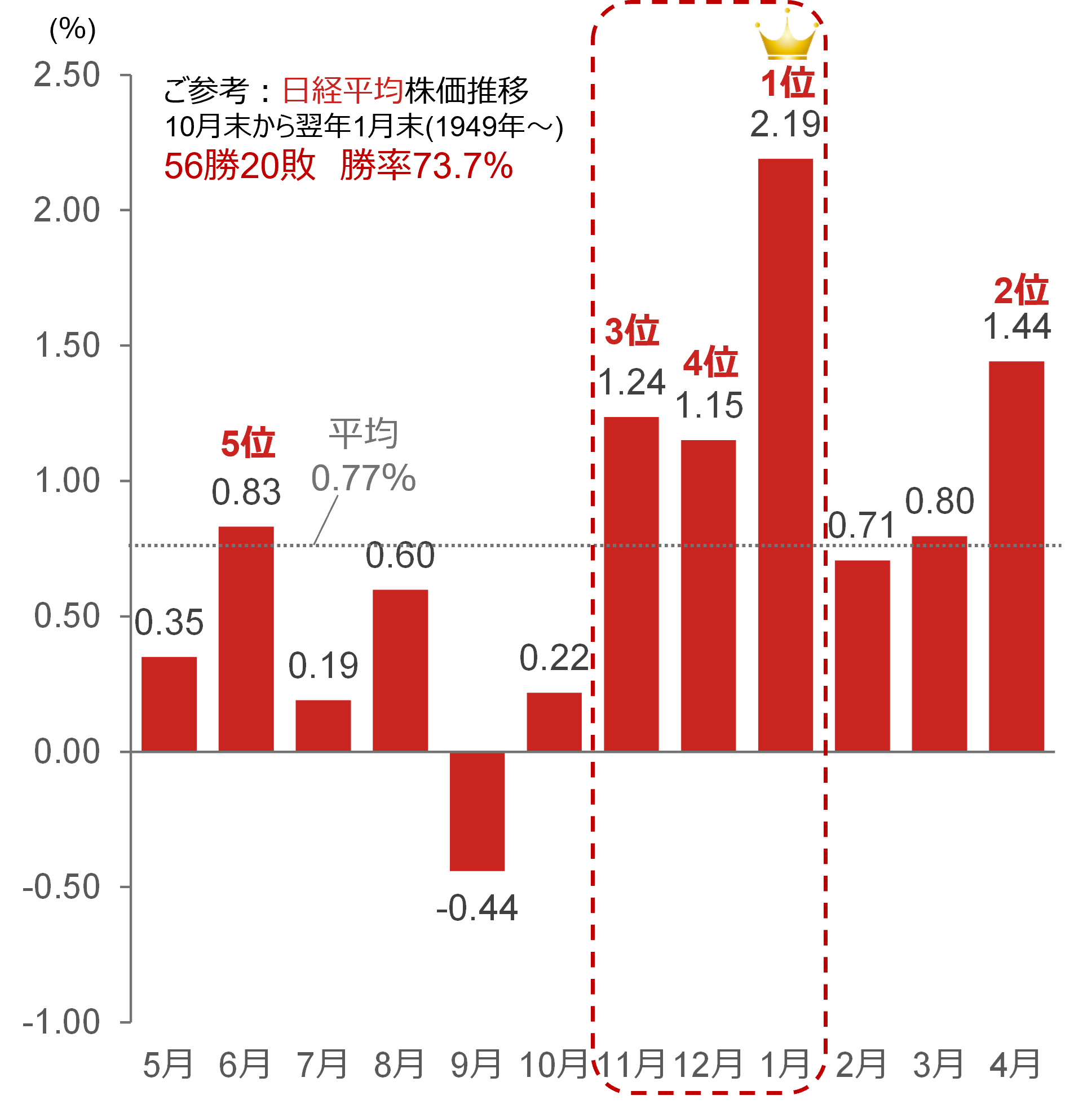 特にパフォーマンスが良いのは11月から翌年1月で、10月末~翌年1月末の期間については、戦後の東証再開以降で56勝20敗と勝率は約7割に達します。