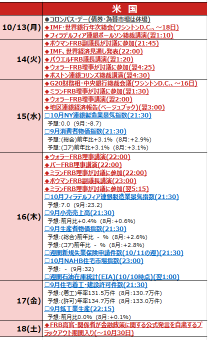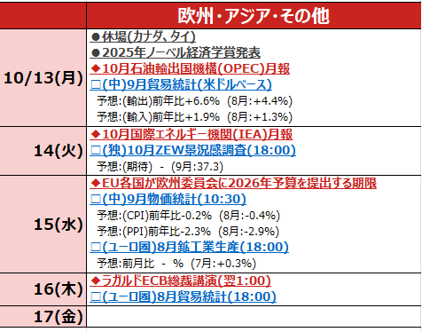 (注)イベントは全てを網羅している訳ではない。◆は政治・金融政策関連、□は経済指標、●はその他イベント(カッコ内は日本時間)。休場・短縮取引は主要な取引所のみ掲載。各種イベントおよび経済指標の市場予想(ブルームバーグ集計に基づく中央値)は2025年10月10日時点の情報に基づくものであり、今後変更される可能性もあるためご留意ください。なお、米国で2025年10月1日から実施された連邦政府機関の一部閉鎖の影響で、米国の経済指標の一部で発表が延期または中止されるものがありますのでご注意ください。