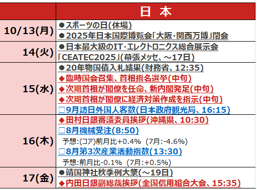 日本では、今後、臨時国会が召集され首相指名選挙が実施されます。首相指名選挙の実施日は当初15日(水)との見方が優勢でしたが、公明党や野党との連立を見据えた協議に時間を要し、翌週20日(月)~21日(火)まで日程が後ずれする可能性が高まっています。首相指名選挙では高市自民党総裁が首相に選出される公算が大きいとみられます。閣僚の顔ぶれや、野党との連立を踏まえた政策合意などによっては、高市総裁が目指す政策の方向性が変化する可能性もあり、相場を左右する要因になりそうです。