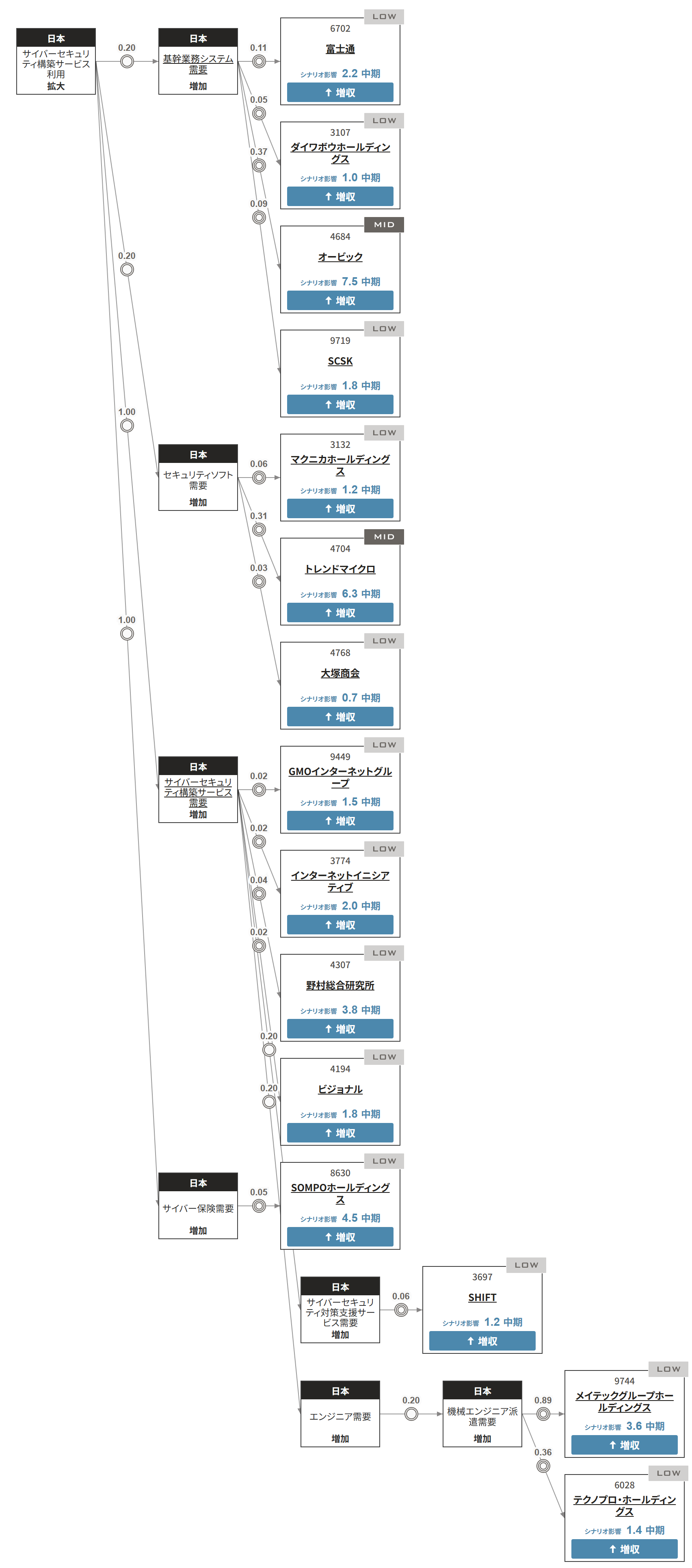 日本企業を狙ったランサムウエア(身代金要求型ウイルス)による攻撃が増加し、被害が深刻化しています。アサヒグループホールディングス(GHD、2502)はサイバー攻撃の影響により、2025年11月12日に予定していた1〜9月期の決算開示を延期しました。2024年6月のKADOKAWA(9468)、同年10月のサイゼリヤ(7581)、今回のアサヒGHDの事例はいずれもランサムウエアが原因とされ、セキュリティー対策の強化が急務となっています。AI「xenoBrain」は、「サイバーセキュリティー構築サービス利用拡大」が他のシナリオにも波及する可能性を考慮し、影響が及ぶ可能性のある15銘柄を選出しました。