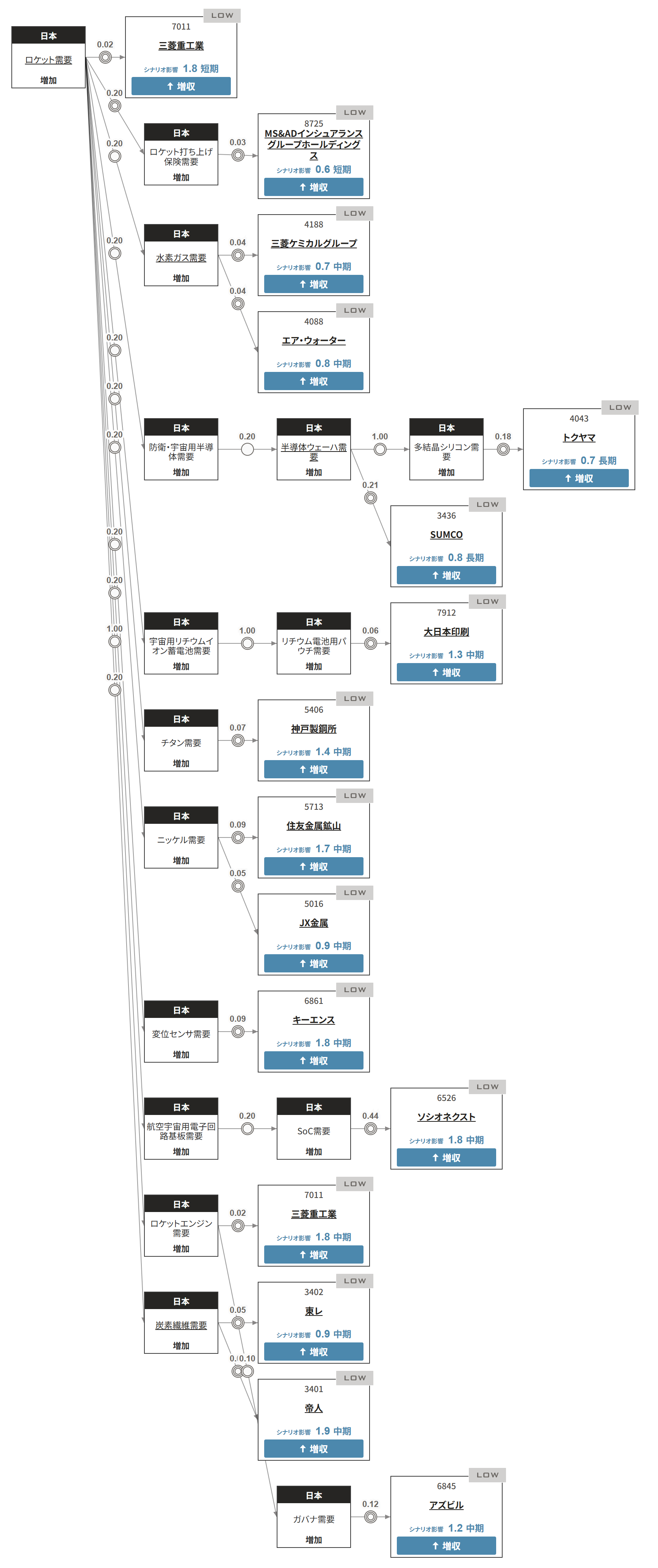 米スペースXは2025年10月13日、大型ロケット「スターシップ」の11回目の試験打ち上げを行い、2回連続の成功となりました。エンジンや燃料タンクを再使用しており、安定運用ができれば、打ち上げ費用が下がり、衛星打ち上げや探査計画の拡充を後押しするとみられます。一方、日本では宇宙航空研究開発機構(JAXA)が10月8日、基幹ロケット「H3」8号機を12月7日に種子島宇宙センターから打ち上げると発表しました。新しい衛星の運用が進むことで、位置情報の精度が上がり途切れにくくなります。都市部や山間部でも安定して使えるようになり、災害対応や精密農業、物流の最適化、自動運転・ドローン航行など、位置情報を活用した産業の高度化が進む見通しです。AI「xenoBrain」は、「ロケット需要増加」が他のシナリオにも波及する可能性を考慮し、影響が及ぶ可能性のある15銘柄を選出しました。