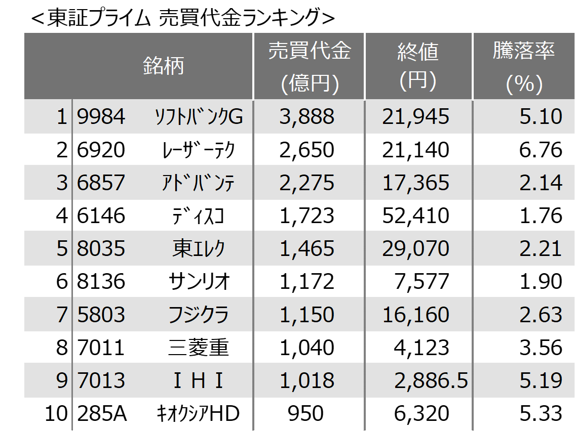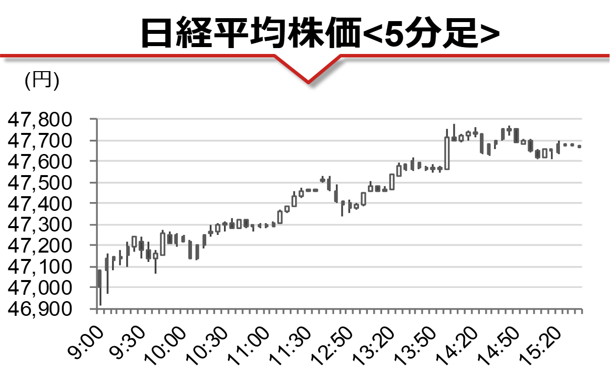 15日の日経平均株価は、値がさの半導体関連株の上昇がけん引し、反発となりました。寄り付きは前日比154円高の47,002円で始まり、その後は1日を通して上げ幅を拡大させた値動きが続きました。14日に大きく下落した値がさ株を中心に自律反発のような動きがみられ、幅広い銘柄や業種が上昇しました。その後、アジア株も堅調な推移がみられたほか、14時過ぎにはオランダの半導体製造装置大手ASMLホールディングの決算が発表され、2025年7-9月期の受注額が市場予想を上回り、市場から好感されました。これらを受けて日本の半導体関連株は一段高となり、日経平均株価は前日比927円高となる場面もありました。米ドル円は円高進行となったものの、日経平均株価の終値は前日比825円高の47,672円となり、14日の下げ幅を半分以上戻し取引を終えました。個別株ではソフトバンクグループが前日比+5.10%となり、1銘柄で日経平均株価を215円押し上げました。