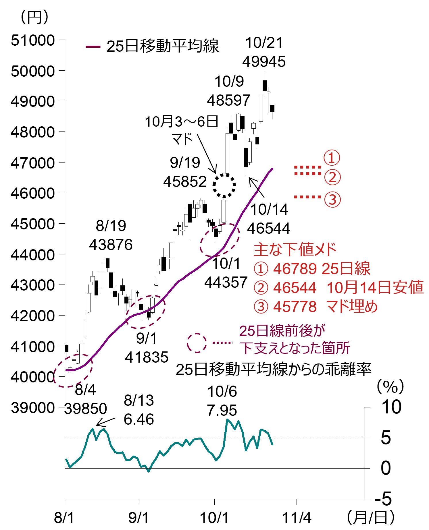 この先、さらなる調整となった場合は、これまで何度も下支えとなっている上向きの25日移動平均線(図1-①:10月23日時点46,789円)や、10月14日安値(図1-②46,544円)の水準で下げ止まるか注目されます。仮に同水準を割り込んだ場合は、10月3~6日のマド埋め水準(図1-③:45,778円)が、次の下値メドとして挙げられます。