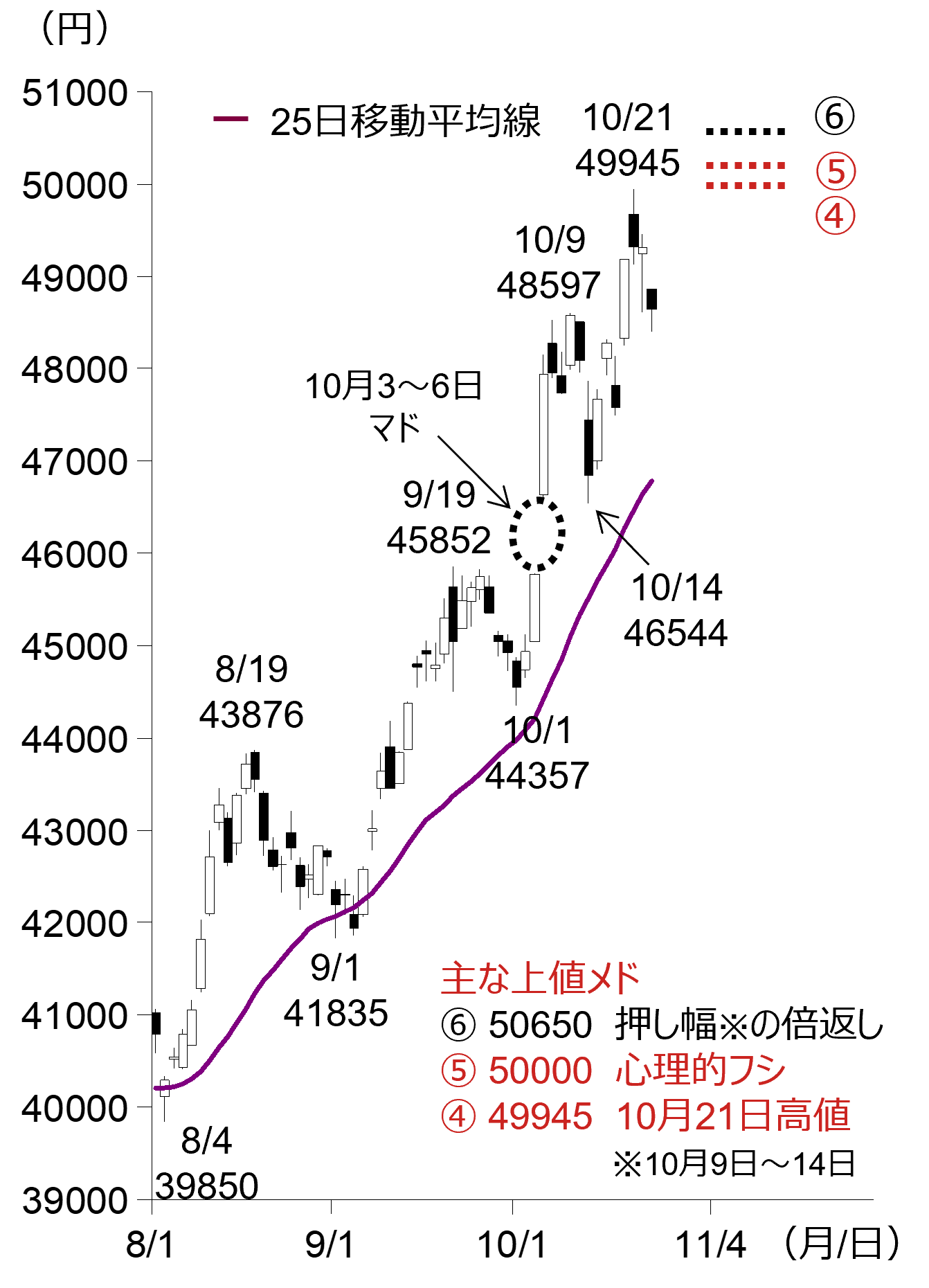 一方、軽い押しにとどまり、再び上昇となった場合、10月21日につけた史上最高値(図2-④:49,945円)を超えることができるか、そして心理的フシである5万円(図2-⑤)を突破し維持することができるかが注目点です。