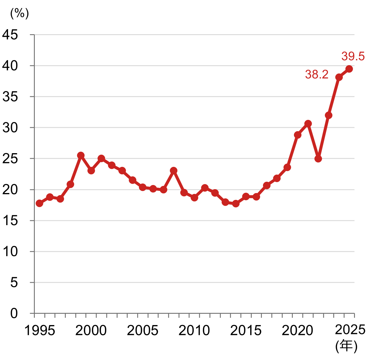 (注)各年末時点における時価総額上位10社の、S&P500指数全体の時価総額に占める比率。直近値は2025年10月10日時点。同一企業が発行する種類株2銘柄がS&P500指数に採用されている場合、その2銘柄を1社として扱っている。