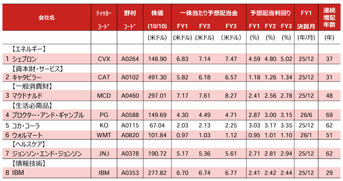 (注)FY1は予想1期目。一株当たり予想配当金は、各期の年間一株当たり配当金総額。予想配当利回りは、各期の一株当たり予想配当金を2025年10月10日時点の株価で除したもの。配当予想は2025年10月10日時点のLSEG集計によるアナリスト予想平均で、その後変更となっている可能性には留意。連続増配年数は、直近決算期(FY1が2025年12月期の企業の場合は2024年12月期)までの年数。全てを網羅しているわけではない。2025年10月10日時点のS&P500指数の12ヶ月先予想配当利回り(今後4四半期の予想配当金合計額を基にした配当利回り)は1.19%。