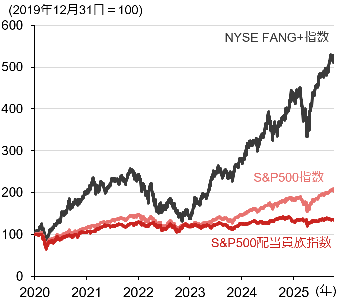 (注)データは日次で、直近値は2025年10月10日。NYSE FANG+(プラス)指数とは、フェイスブック(2021年10月よりメタ・プラットフォームズに社名変更)、アマゾン・ドットコム、ネットフリックス、グーグル(親会社アルファベット)の頭文字をつないだ「FANG」に、大手情報技術関連6銘柄を加えた10銘柄に等金額投資する株価指数。価格指数の推移。