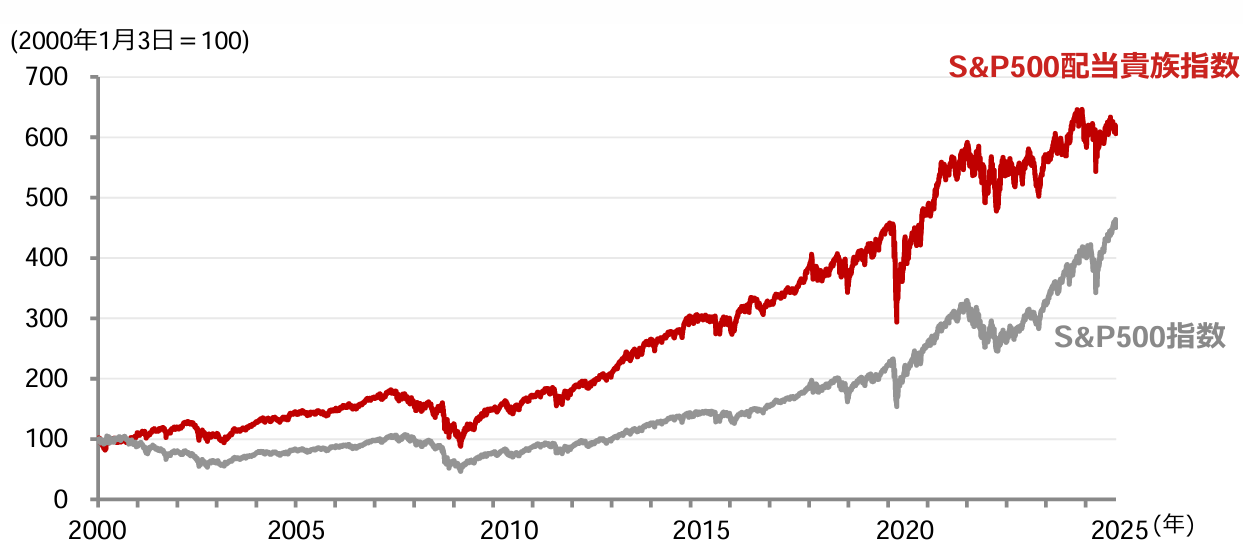 近年、超大型の情報技術関連銘柄が株式市場で選好された結果、S&P500配当貴族指数がS&P500指数をアンダーパフォームする場面が見られます。