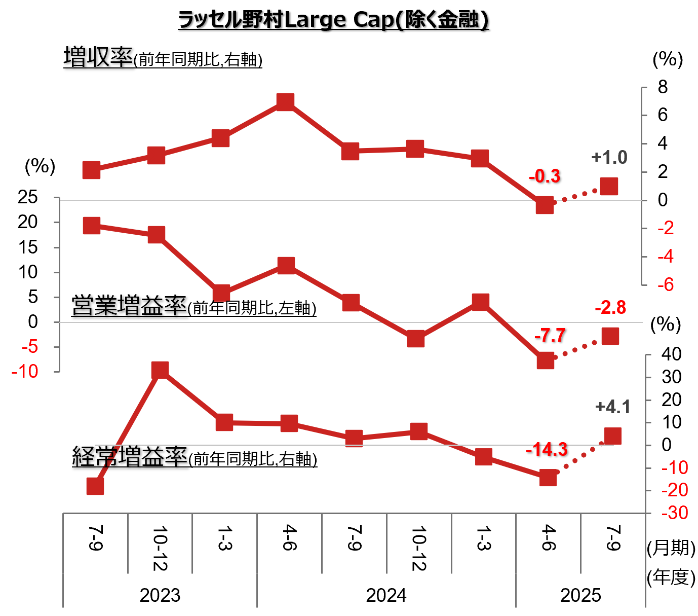 (注1)ラッセル野村Large Cap(除く金融)の四半期・増収率および営業増益率、経常増益率の推移。