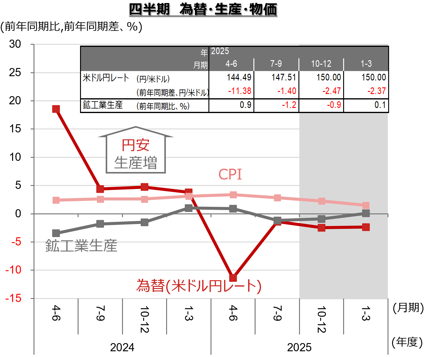 (注)米ドル円レート(前年同期差)、鉱工業生産(前年同期比)、消費者物価(CPI、前年同期比)の四半期推移。2025年4-6月期までは実績値。2025年7-9月期以降の鉱工業生産および消費者物価は、野村證券経済調査部による推計・予想値(2025年10月20日時点)。2025年7-9月期以降の米ドル円レートは、2025年10月20日時点の業績予想前提。米ドル円レートの前年同期差でマイナスは円高。