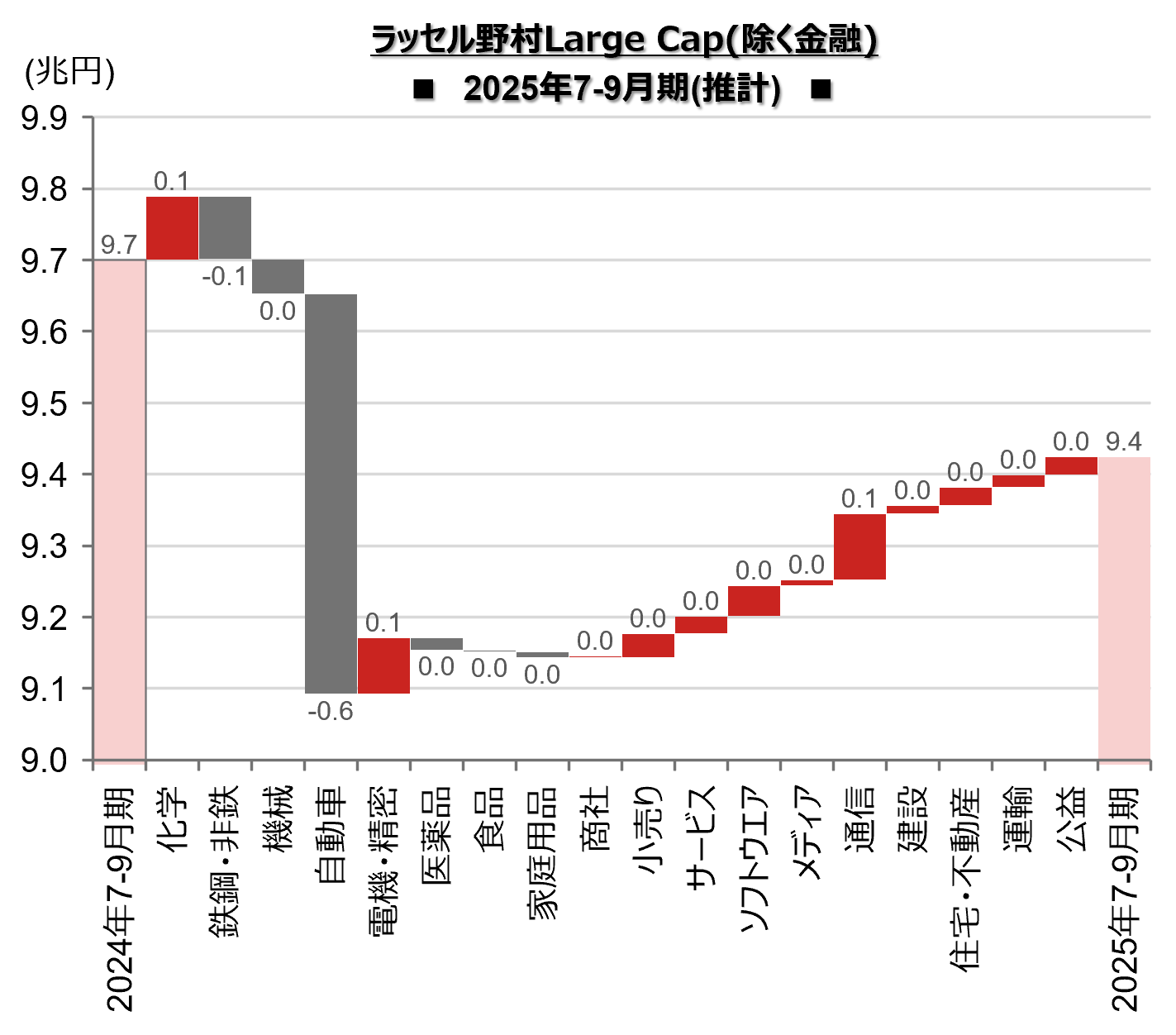 (注)ラッセル野村Large Cap(除く金融)の営業利益の、2025年7-9月期・業種別増減益寄与額。2025年9月30日時点の市場コンセンサス予想で、コンセンサス予想が存在している1/2/3月決算企業のみで集計している。