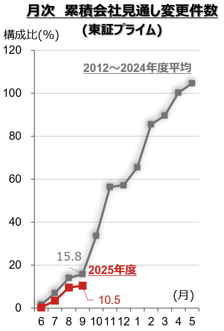 加えて、今年度は特に米国の関税政策の影響で9月までの累積変更件数は例年の3分の2程度にとどまっています。また、期初想定よりも為替が円安気味で推移していることも手伝って、通期見通しを変更する企業が例年以上に多くなる可能性が高いと考えられます。