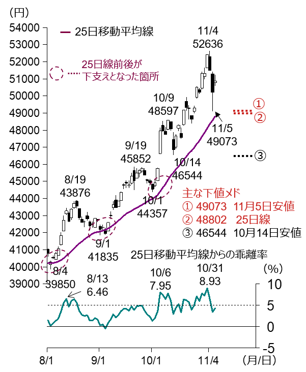 チャートを見ながら振り返ってみましょう。日経平均は「押し目待ちに押し目なし」の強い上昇の末に、10月27日に心理的フシの5万円を超え、11月4日には52,636円をつけました。ただ、短期的過熱感がみられる中で、翌5日には前日の米国株安を受けて大幅安となり一時49,073円(図1-①)まで下落しました。