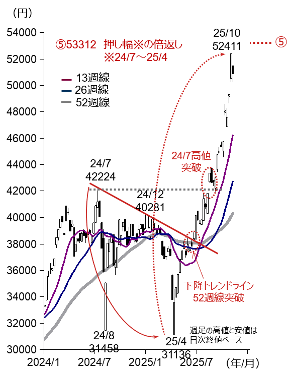 一方で、11月5日安値形成後は反発に転じており、この先4日につけた史上最高値(図2-④:52,636円)を超えて上昇再開となるかが焦点です。その場合の上値メドとして、2024年7月高値から25年4月安値までの押し幅の倍返し(図3-⑤:53,312円)の水準が挙げられます。