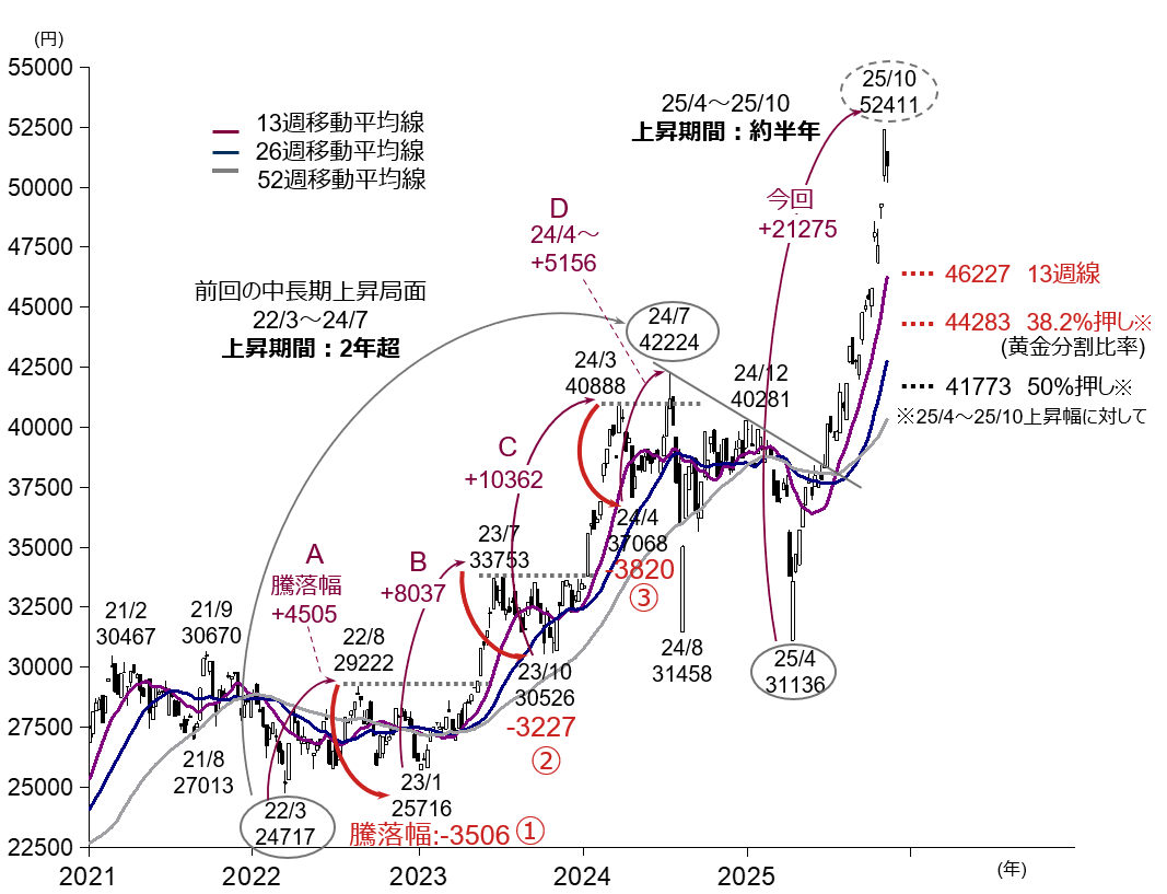 一方で2025年10月高値形成後の調整は、安値から約半年後の調整です。前回の中長期上昇トレンド(2022年3月~24年7月)を含めて、中長期的な上昇は2~3年程度続くことが多くみられます。したがって今回の調整は一時的なものにとどまり、中長期的な上昇トレンド自体は継続する可能性が高いと考えられます。