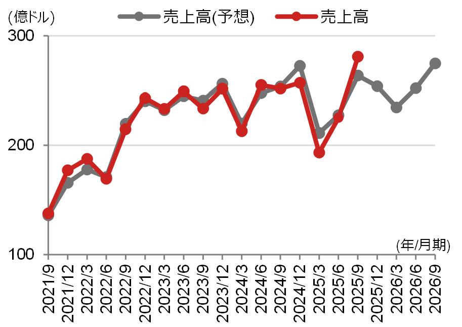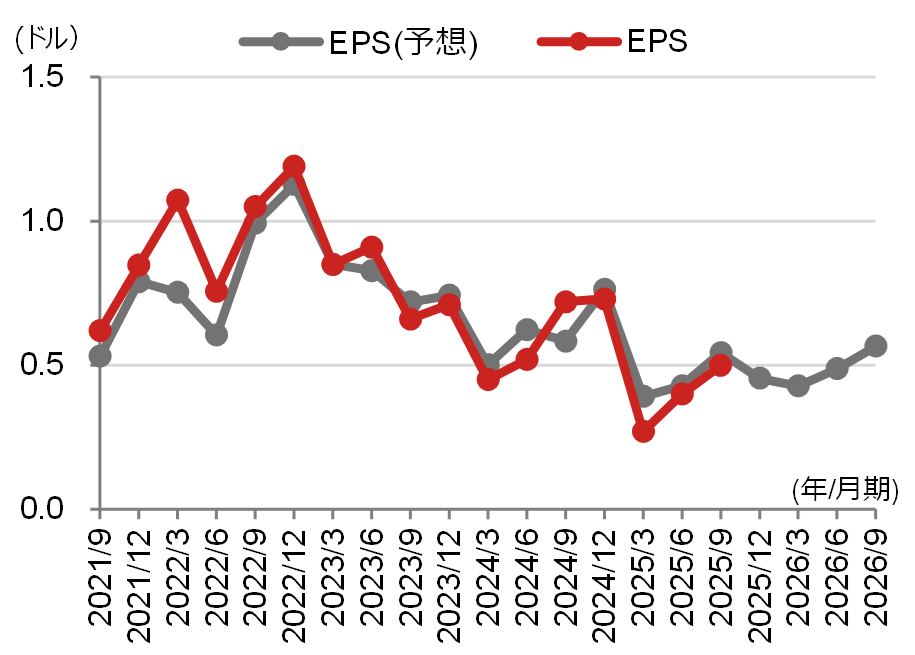(注3)売上高とEPSの推移:赤色は実績で、直近値は2025年7-9月期(2025/9)。灰色はLSEG集計による市場予想平均。2025年10-12月期以降の予想は2025年10月21日時点。