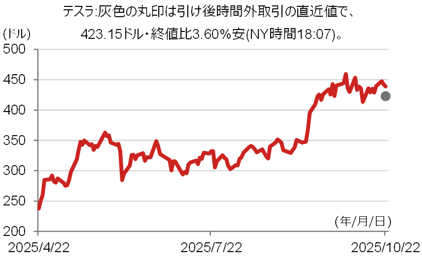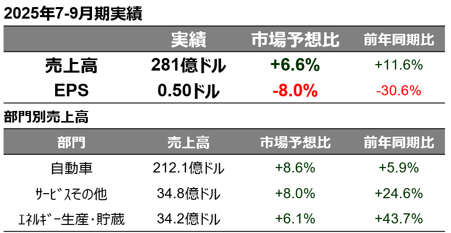 米国時間10月22日引け後に、EVの製造販売や太陽光発電事業を行うテスラ(TSLA US)が2025年7-9月期(2025.12期第3四半期)決算を発表しました。売上高は市場予想を6.6%上回り、EPSは市場予想を8.0%下回りました。