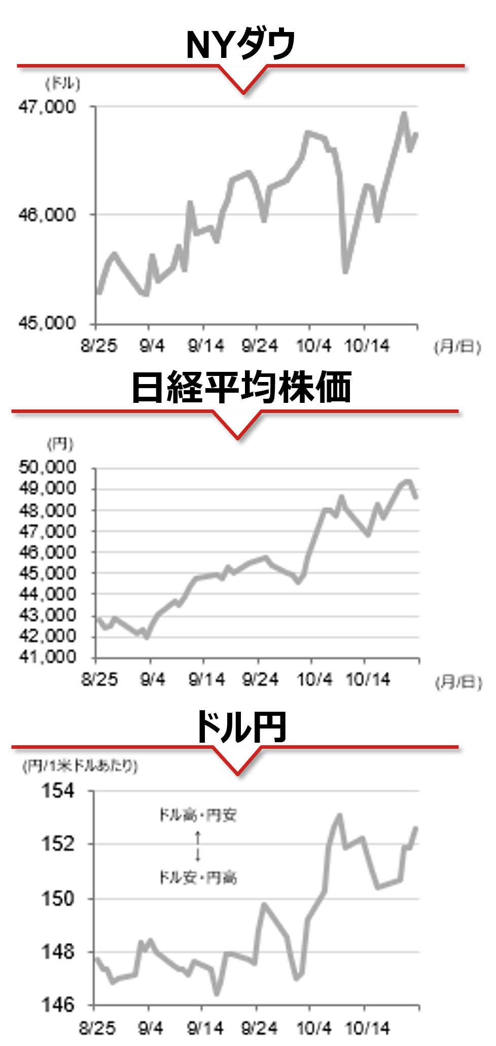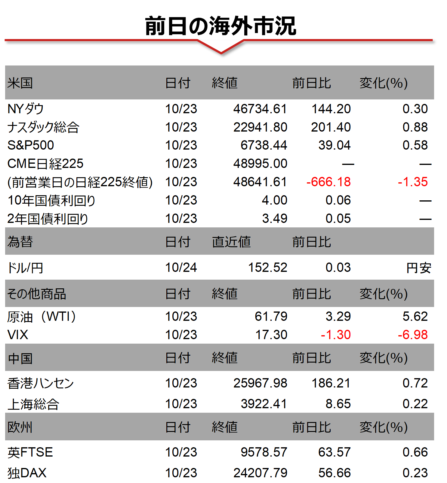 23日の米国株式市場では、ハイテク関連銘柄にけん引され、主要3指数は揃って上昇しました。ホワイトハウスが、トランプ米大統領と中国の習近平国家主席が30日に会談を行うと発表したことが好感されました。トランプ政権がロシア石油企業2社に対する制裁を発表したことを受けて原油相場は大幅に上昇し、米国債利回りは上昇しました。為替市場では主要通貨に対して円が全面安の展開となり、米ドル円は一時152円台後半まで円安が進行しました。なお、本日は延期されていた米国の9月CPI(消費者物価指数)が発表されます。