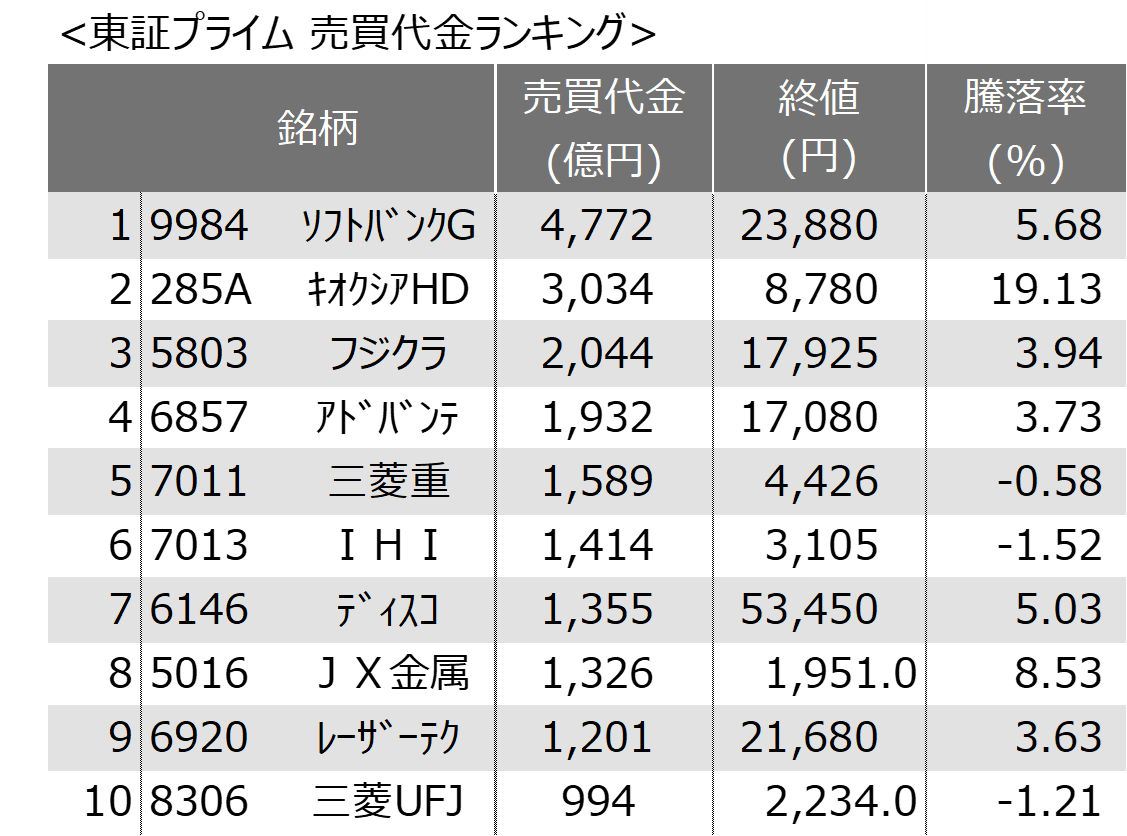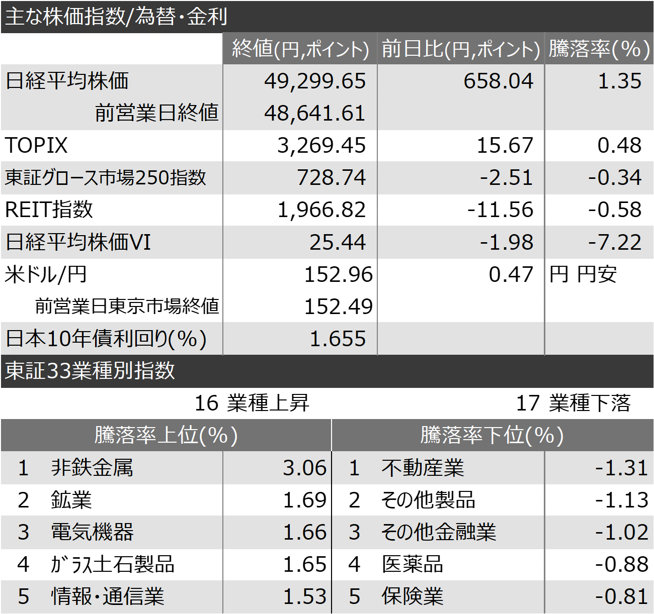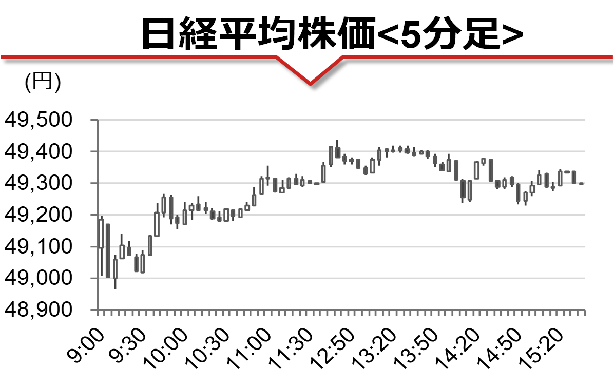 本日の日経平均株価は、半導体関連の成長期待から大きく上昇しました。23日に米半導体大手インテルの好決算によって上昇した米国株式市場の流れを受けて、半導体関連株が市場をけん引し寄り付きから上昇しました。後場において、高市首相が衆院本会議で就任後初の所信表明演説を行ったことも相場の追い風となりました。中長期の経済・財政政策において、責任のある積極財政を考え方の基本として戦略的に財政出動を行うと表明しました。経済成長の戦略分野としてAI・半導体・航空宇宙などをあげ、大胆な投資促進といった支援策を講ずるとしました。また、27日からのトランプ米大統領の来日に関して、日米関係をさらなる高みに引き上げると宣言しました。最終的に日経平均株価は前日比658円増の49,299円となりました。個別では、ソフトバンクグループが投資先のハイテク企業の成長期待によって株価が上昇し、前日比+5.68%となり、日経平均株価を259円押し上げました。