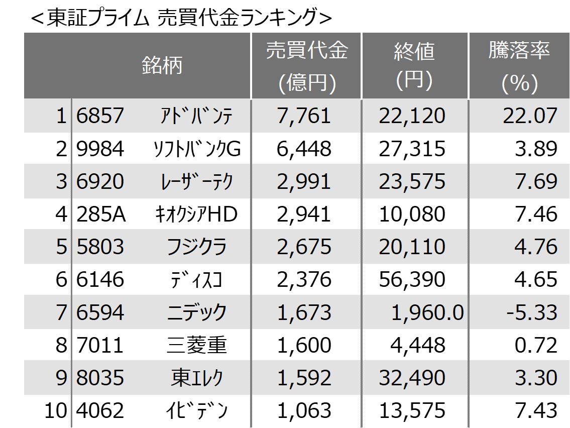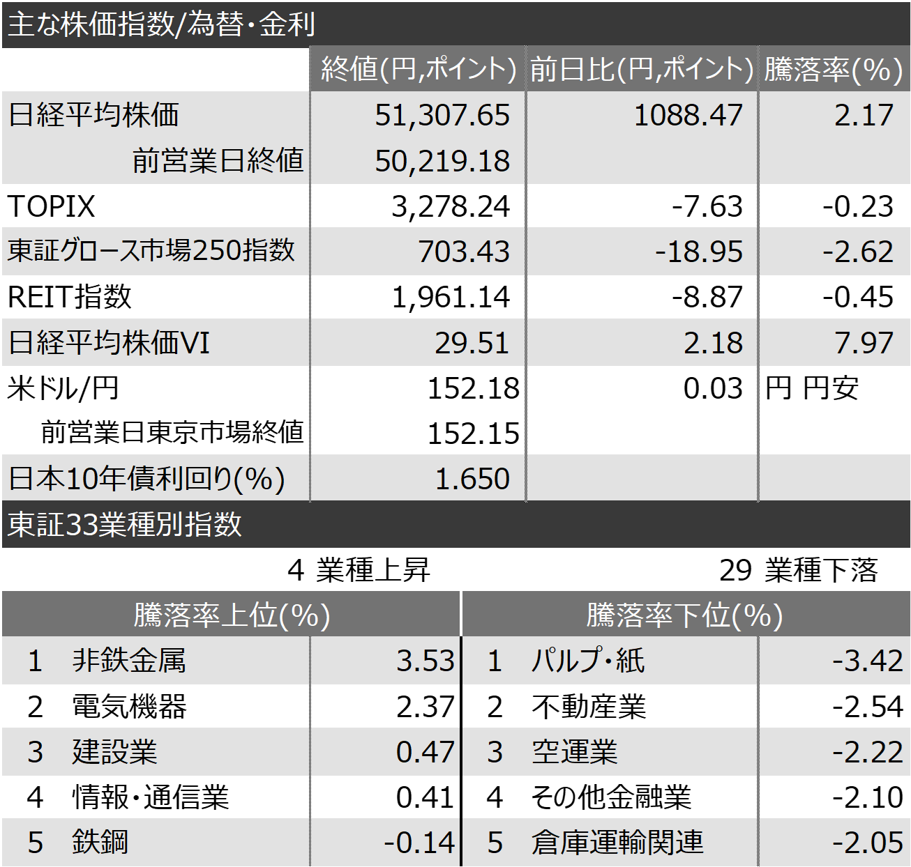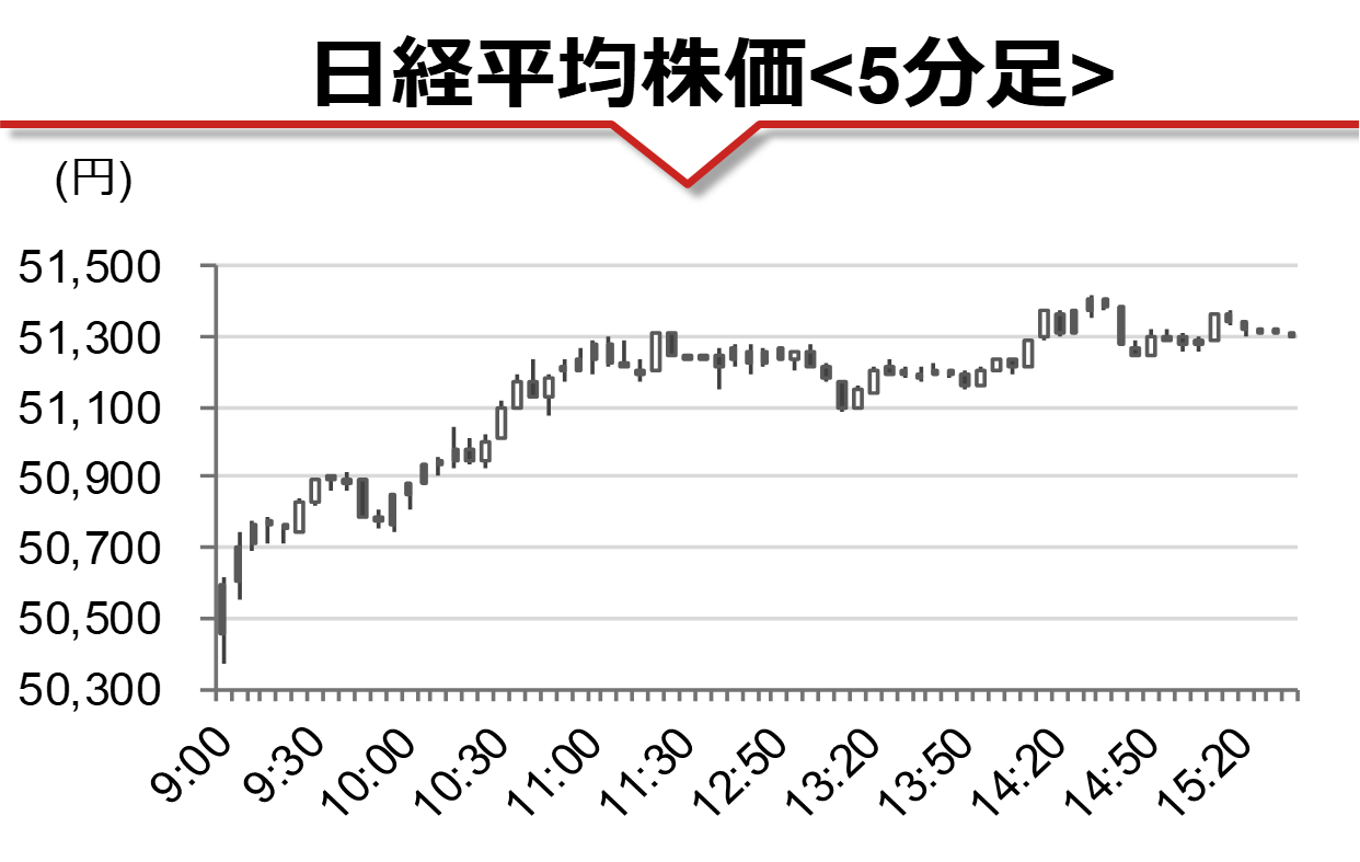 29日の日経平均株価は、AI関連銘柄の上昇により大きく反発しました。日経平均株価は寄り付き後急上昇し、51,000円台に達すると、その後は終日、前日比1,000円高を挟んだ水準での推移が続きました。28日の米国株市場での大手テクノロジー株の上昇を受け、日本でも値がさの半導体関連株が上昇し相場をけん引しました。また、28日に約4,000億米ドル規模の「日米間の投資に関する共同ファクトシート」が発表され、AIインフラに関する供給網の強化などに関心を示す日本企業が盛り込まれました。名前が挙がった、ソフトバンクグループ、日立製作所、フジクラなどの企業群は、ビジネス拡大への期待感が高まり株価が上昇し、相場を押し上げました。日経平均株価の終値は前日比1,088円高の51,307円となり、史上最高値を大幅に更新し取引を終えました。個別企業では、アドバンテストが28日に発表した決算内容が好感され、終値でも前日比+22.07%のストップ高まで上昇し、1銘柄で日経平均株価を1,077円押し上げました。一方、東証プライム市場の値下がり数は全体の86%であり、市場全体でみるとやや軟調な展開となりました。