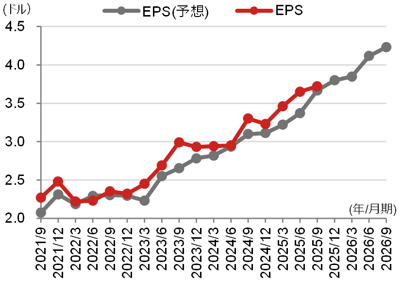 (注3)売上高とEPSの推移:赤色は実績で、直近値は2025年7-9月期(2025/9)。2025年10-12月期の売上高の白丸は会社見通し中間値。灰色はLSEG集計による市場予想平均。2025年10-12月期以降の予想は2025年10月28日時点。