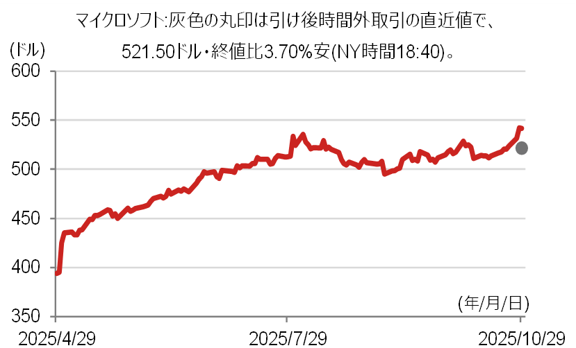 マイクロソフトの株価は、前日比0.10%安で引けた後、決算発表を受けて時間外取引では、終値比3.70%安の521.50ドルで推移しています(NY時間18:40)。通常よりもEPSの実績が市場予想を上回る幅が小さかったことや、その背景にあるAI関連を含む費用実績の増加、決算発表前に株価が上昇していたことによる利益確定の動きなどが要因と考えられます。