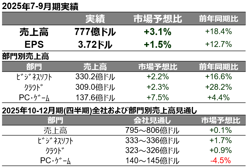米国時間10月29日引け後に、「Office」や「ウインドウズ」、クラウドソフトの「Azure(アジュール)」などで知られるソフトウェア企業であるマイクロソフト(MSFT US)が2025年7-9月期(2026.6期第1四半期)決算を発表しました。売上高は市場予想を3.1%上回り、EPSは市場予想を1.5%上回りました。