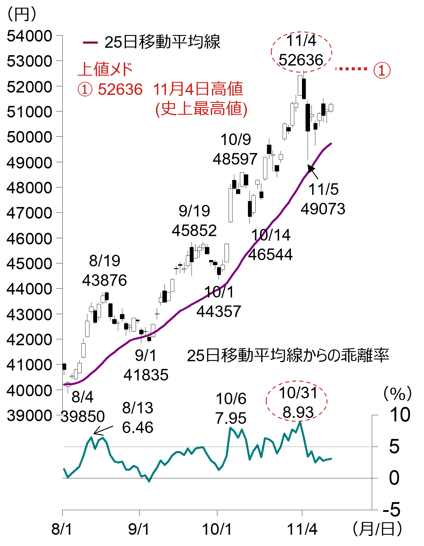 チャートを見ながら11月の動きを振り返ってみましょう。日経平均は11月4日高値(52,636円)形成後に一時大幅に調整しました。短期的な過熱感が下落要因の一つで、25日移動平均線からの乖離率は10月31日に一時8.93%に達していました。ただし、11月13日時点で株価は落ち着きを取り戻しています 。