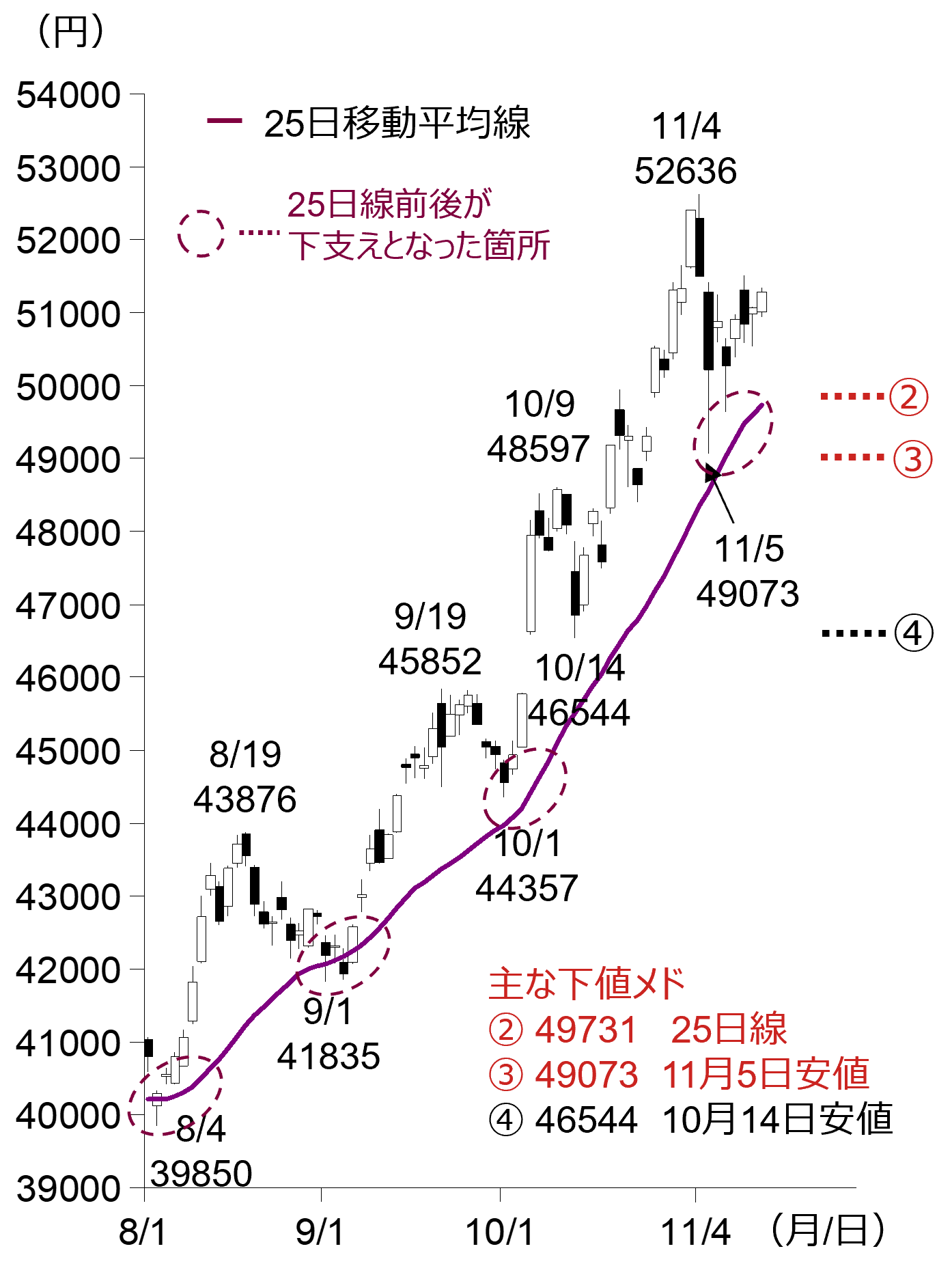 逆に再調整となった場合は、これまで何度も下支えになってきた25日移動平均線(図2‑②:11月13日時点49,731円)や11月5日安値(図2‑③:49,073円)で下げ止まるかが重要です。これらを明確に下回ると、今年4月以降の上昇に対する本格的な調整局面入りの可能性が高まるため警戒が必要です。