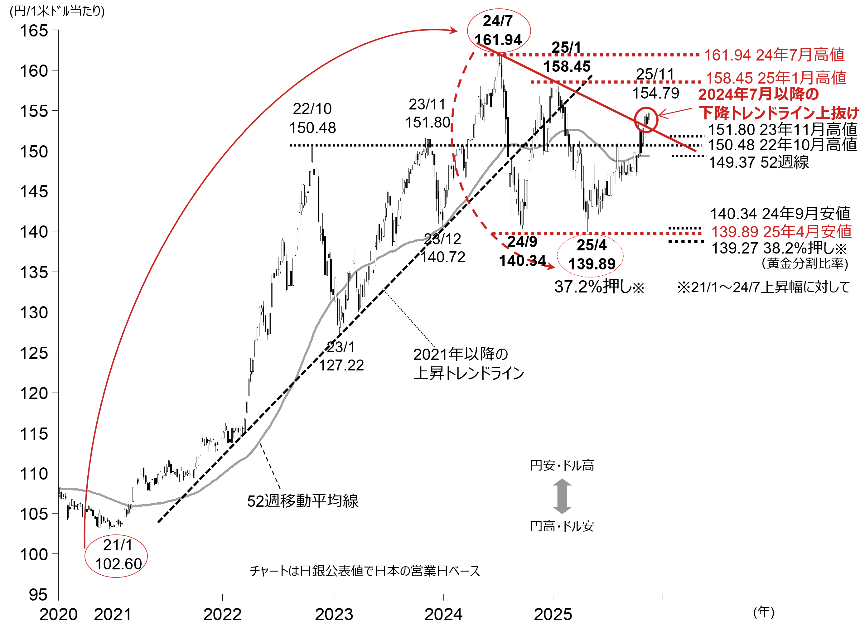 今回の特集は2025年4月から大幅に円安・ドル高が進んだドル円相場です。ドルは対円で10月に1年の平均的な売買コストを示す52週移動平均線(11月12日:149.37円)を明確に上抜け、11月に入ってからは2024年7月以降の下降トレンドラインも上抜けました。