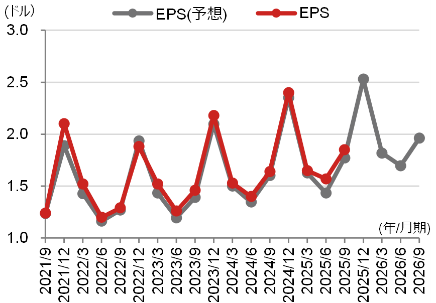 (注3)売上高とEPSの推移:赤色は実績で、直近値は2025年7-9月期(2025/9)。2025年10-12月期の売上高の白丸は会社見通し中間値。灰色はLSEG集計による市場予想平均。2025年10-12月期以降の予想は2025年10月29日時点。