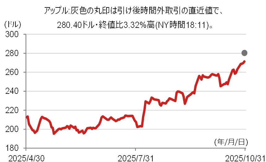 アップルの株価は、前日比0.63%高で引けた後、決算発表を受けて時間外取引では、終値比3.32%高の280.40ドルで推移しています(NY時間18:11)。重要な年末商戦時期についての市場予想を上回る売上高見通しを市場は好感したと考えられます。