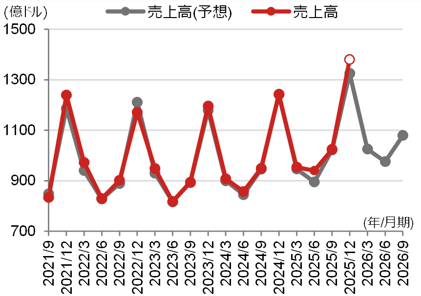 会社の2025年10-12月期売上高見通しは市場予想を上回りました。会社は、7-9月期にあった一部のiPhone端末の供給制約は解消に向かっているとコメントしました。また、会社は中華圏(中国本土、香港、台湾)について、iPhone Airの供給制約により売上高実績が前年同期比で減少したと説明する一方で、2025年10-12月期は前年比で増加に転じるとの見通しを示しました。