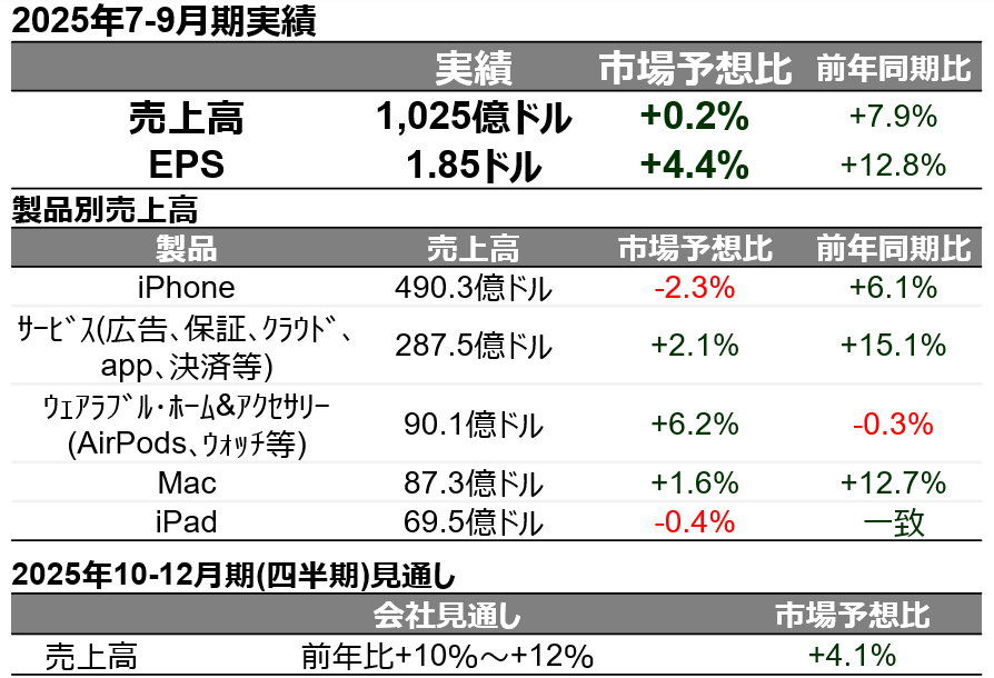 米国時間10月30日引け後に、モバイル端末の製造販売とAI・クラウドサービス事業を行うアップル(AAPL US)が2025年7-9月期(2025.9期第4四半期)決算を発表しました。売上高は市場予想を0.2%上回り、EPSは市場予想を4.4%上回りました。
